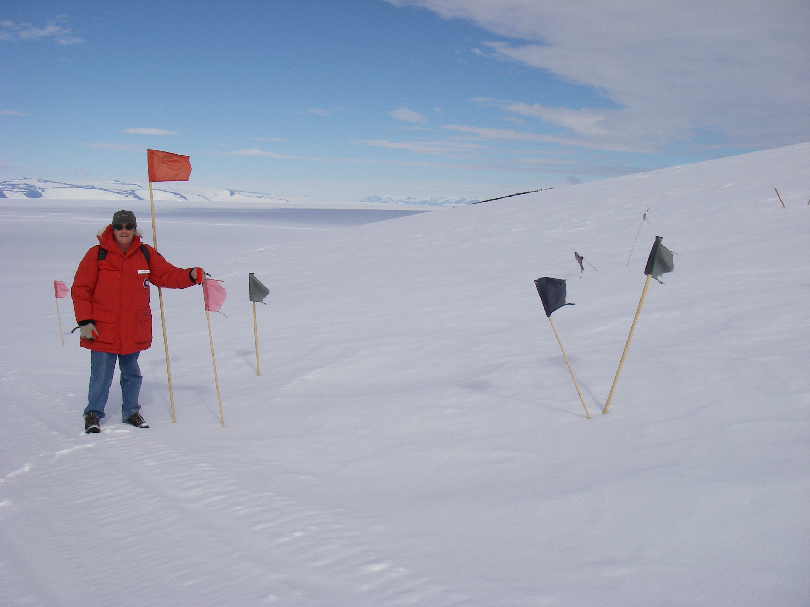 In this photo you can see the new red trail marking flag above Jeff Peneston. As the glacier slowly flows over the rock, it develops cracks called crevasses that can be as much as 100 feet deep and hidden by a thin snowbridge layer on top. You can see the black flags that indicate a dangerous crevasse hidden under the snow. Near McMurdo Station, Antarctica.