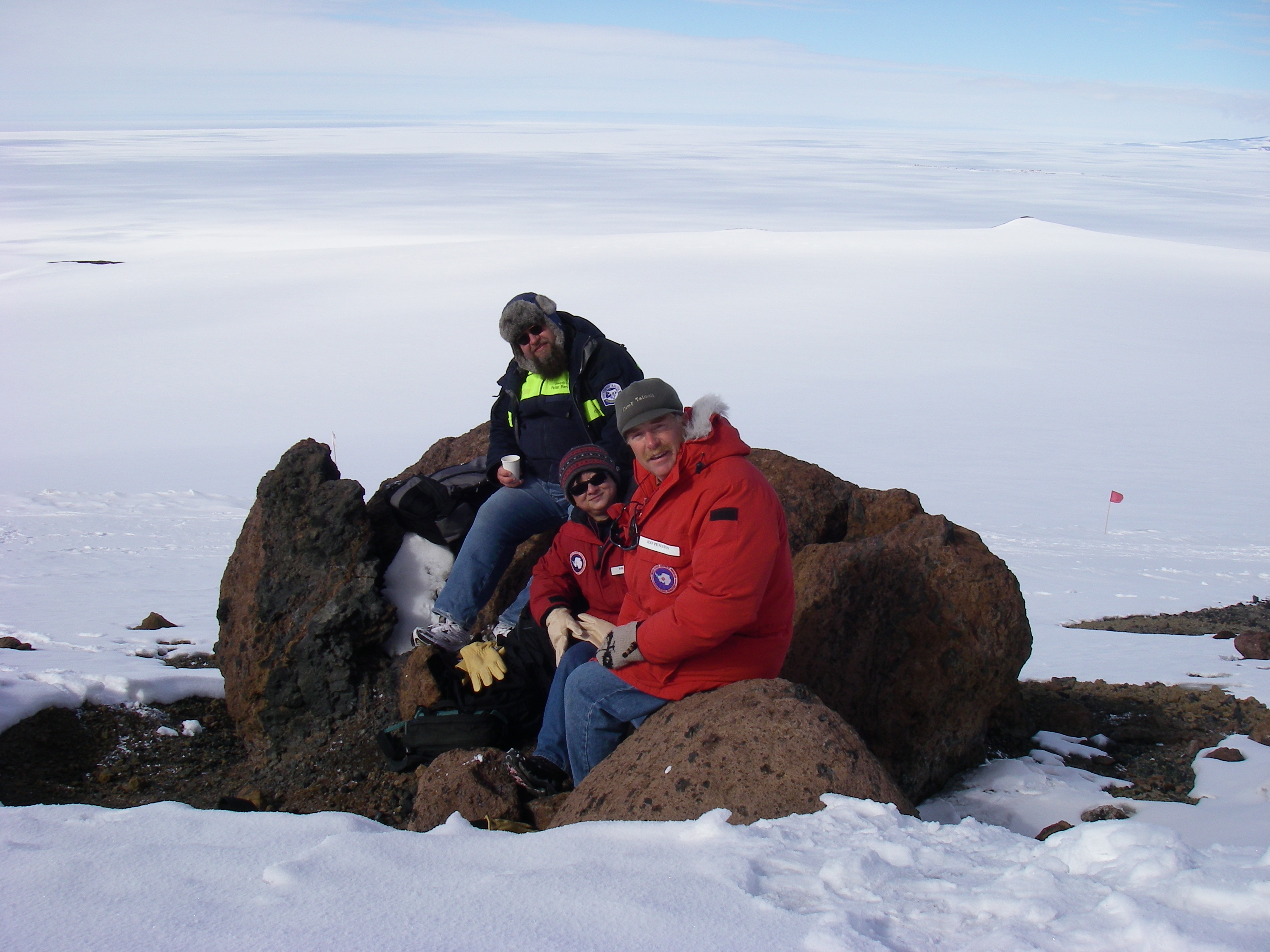 After hiking uphill for about 3.5 miles, the hikers stopped for a Fika to rest on some boulders at the base of Castle Rock. Jeff Peneston brought hot cocoa for everyone. Near McMurdo Station, Antarctica.
