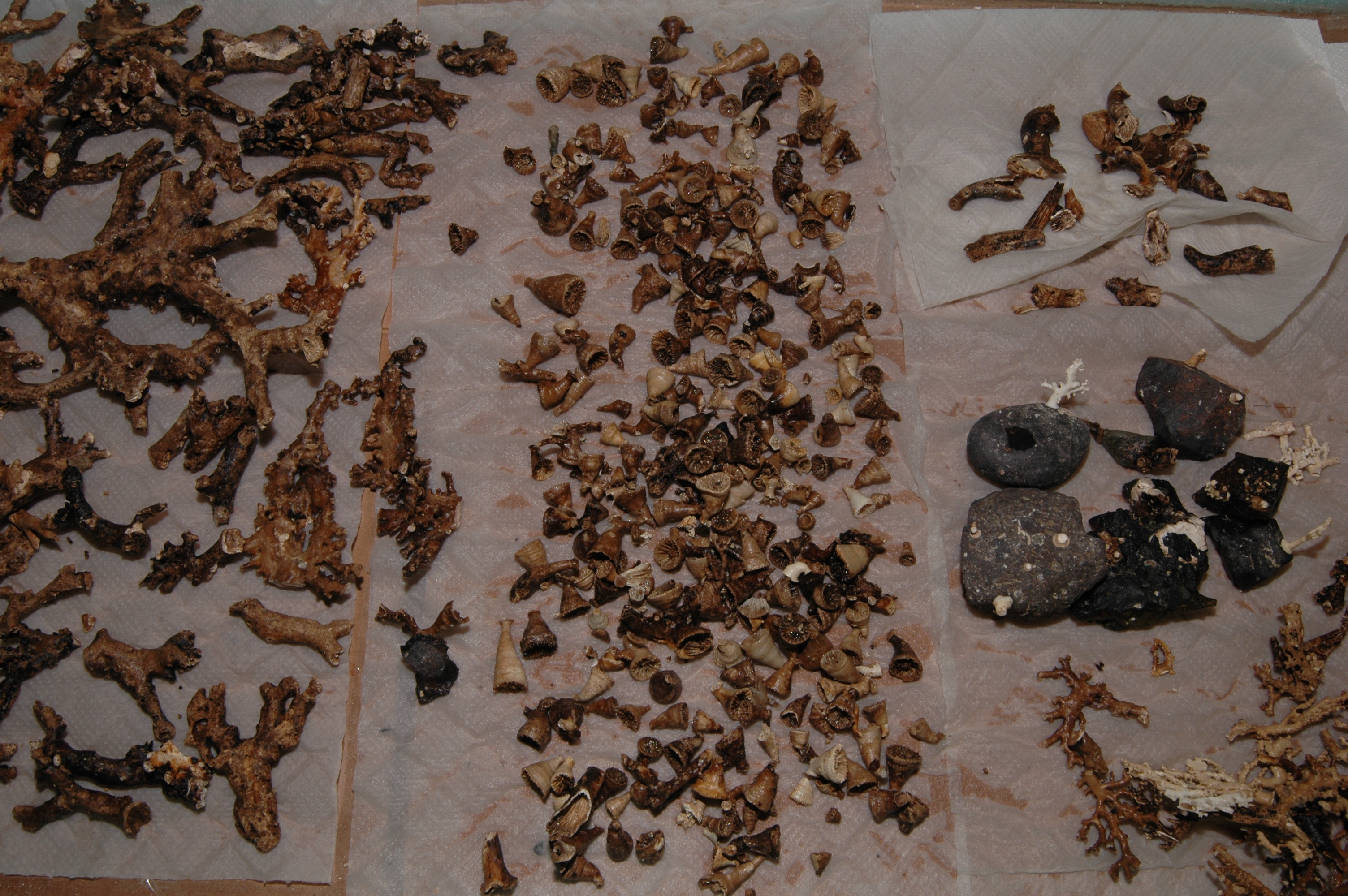 Many different types of fossilized corals that were collected in the box dredge. Aboard the Nathaniel B. Palmer in the Drake Passage in the Southern Ocean.
