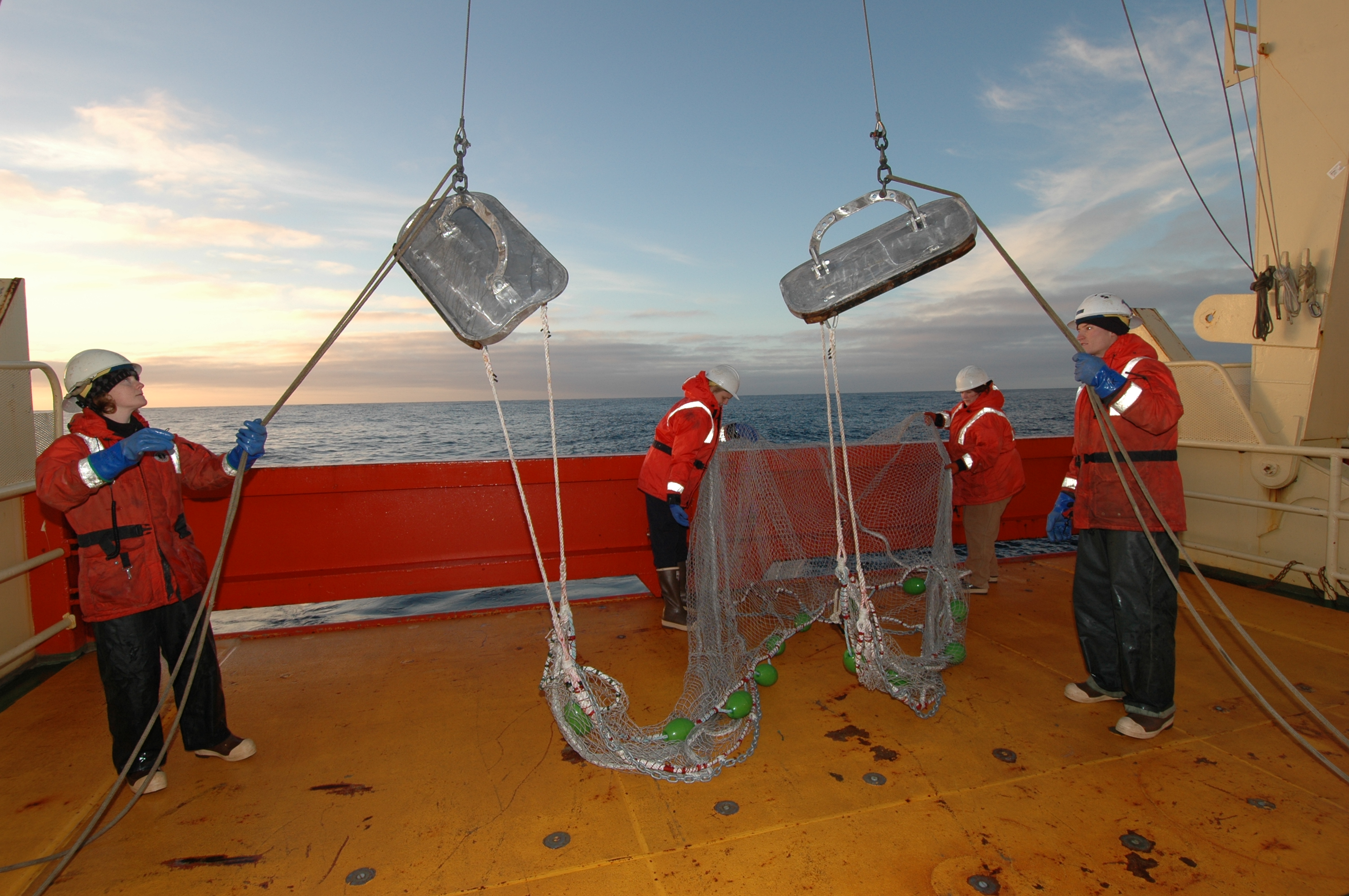 The otter trawl being raised up by the A-frame. Aboard the Nathaniel B. Palmer in the Drake Passage in the Southern Ocean.