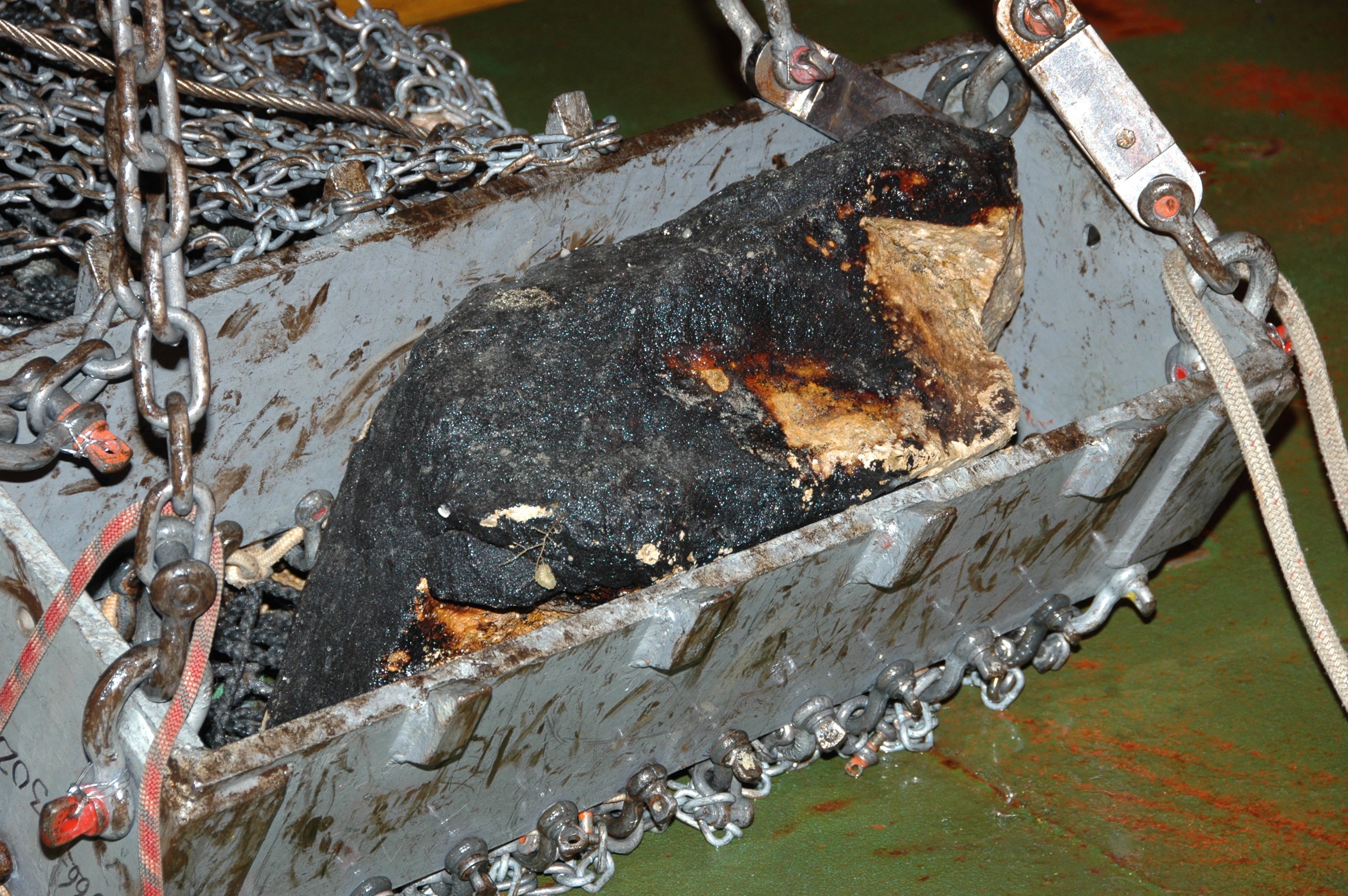 The rock dredge with a massive rock stuck inside it. Aboard the Nathaniel B. Palmer in the Drake Passage in the South Atlantic Ocean.