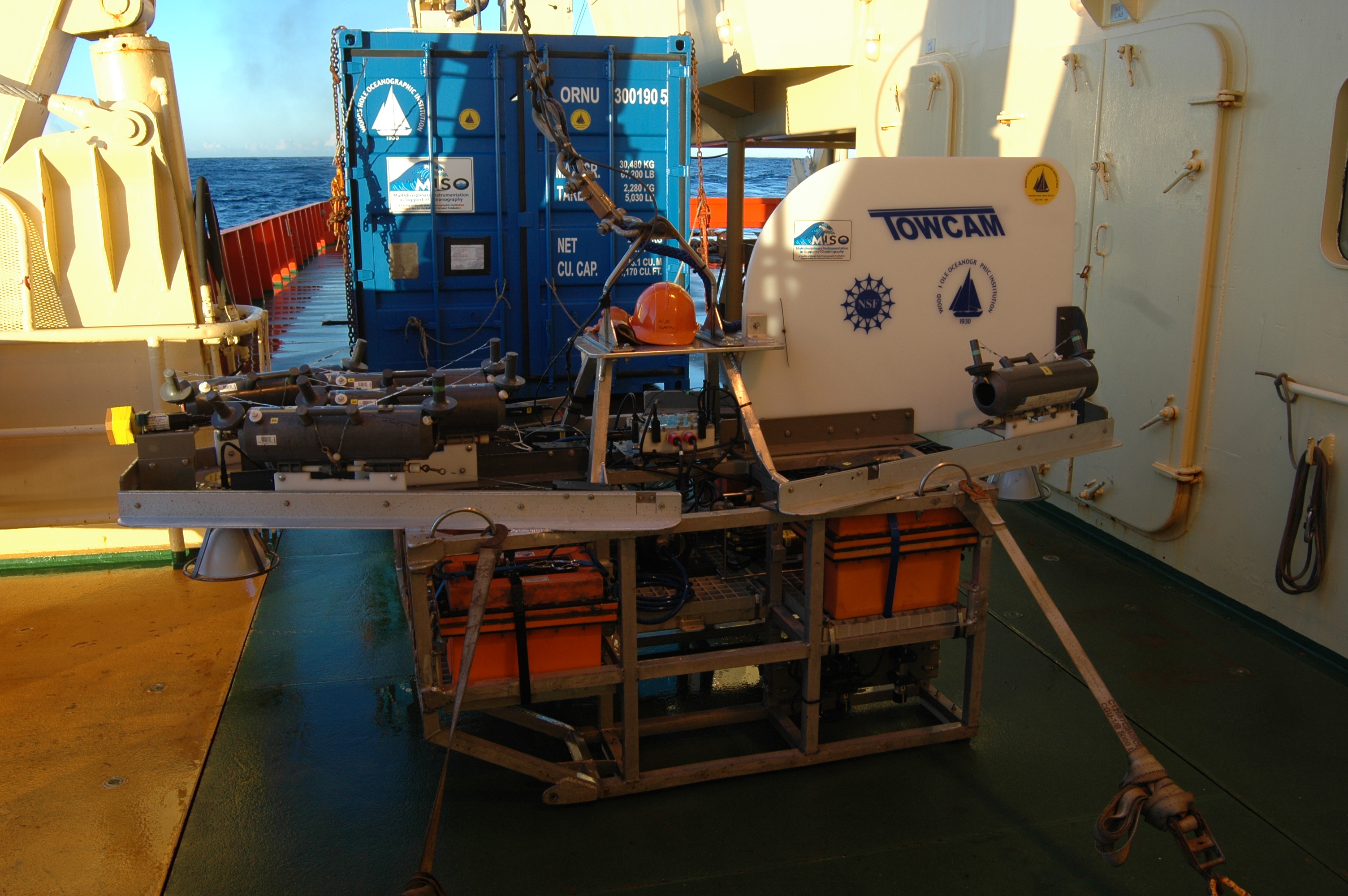 This is the Towcam. It is an underwater camera that is lowered close to the ocean floor and towed very slowly. Aboard the Nathaniel B. Palmer in the Drake Passage in the South Atlantic Ocean.