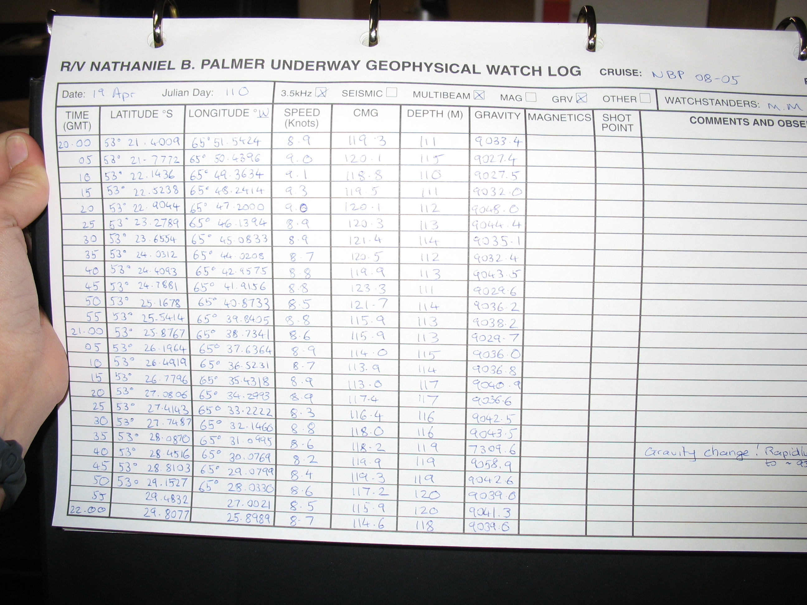 This is the geophysical watchlog where data was recorded every 5 minutes. Aboard the Nathaniel B. Palmer in the Drake Passage in the South Atlantic Ocean.