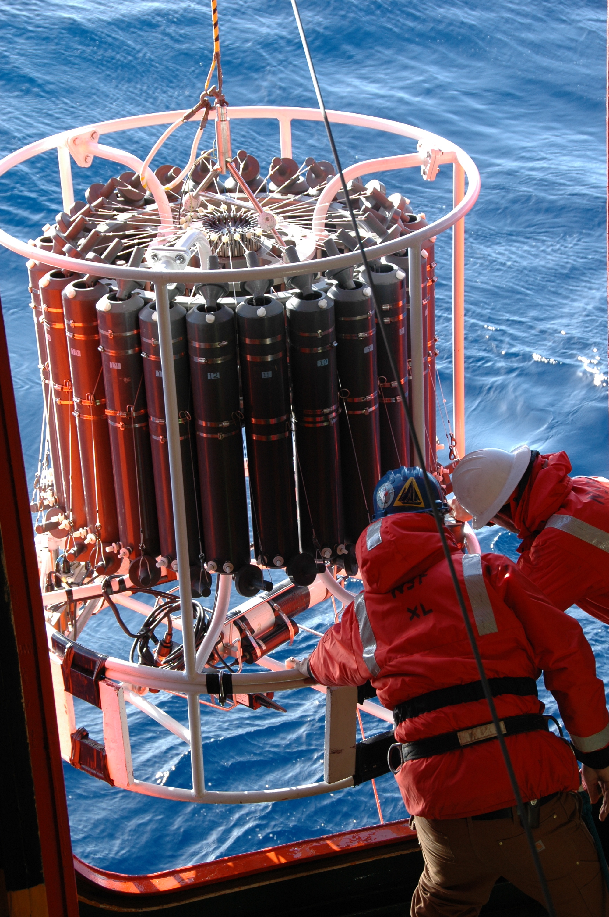 A CTD (conductivity, temperature, and depth recording instrument) being lowered into the ocean. Aboard the Nathaniel B. Palmer near the Drake Passage in the South Atlantic Ocean.