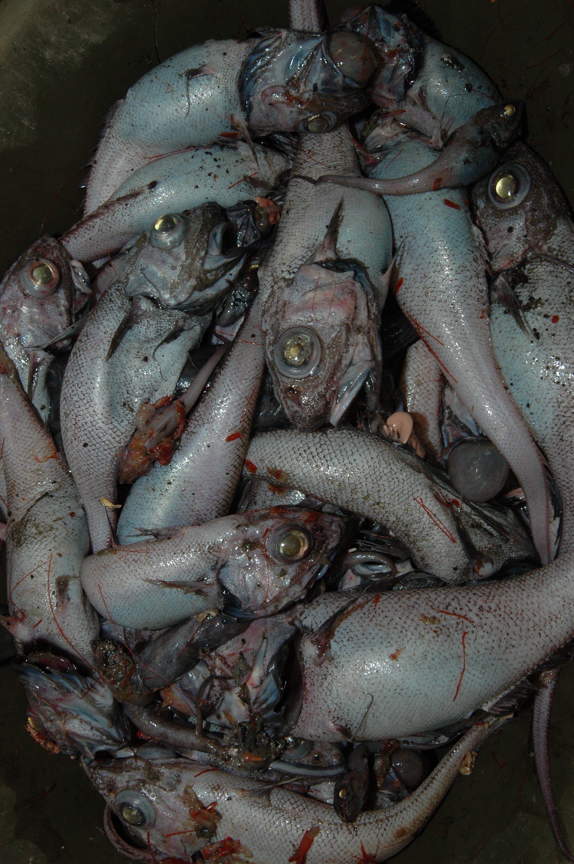 A bucket full of fish that were collected in a box dredge. Aboard the Nathaniel B. Palmer in the Drake Passage in the Southern Ocean.