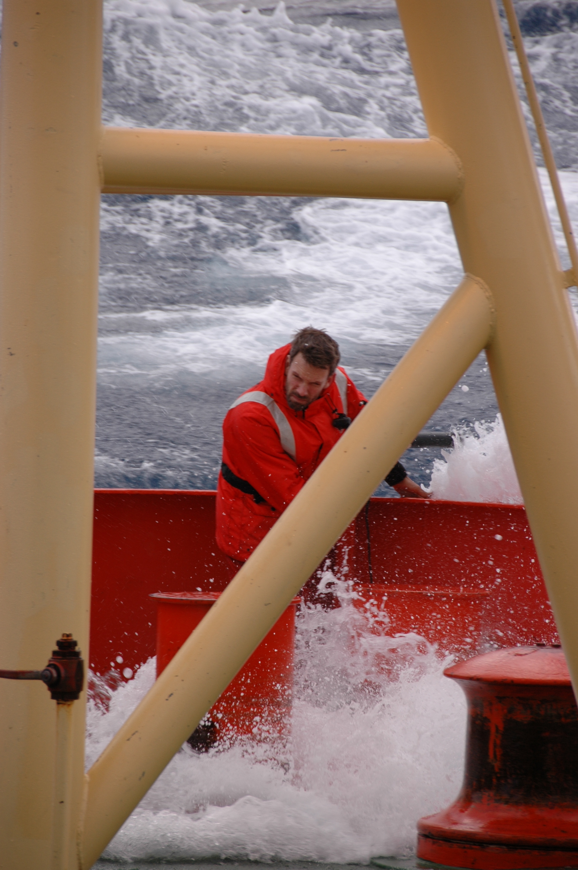 Greg, a marine tech, is working on the back deck of the ship as a wave comes over the side. Aboard the Nathaniel B. Palmer in the Drake Passage.