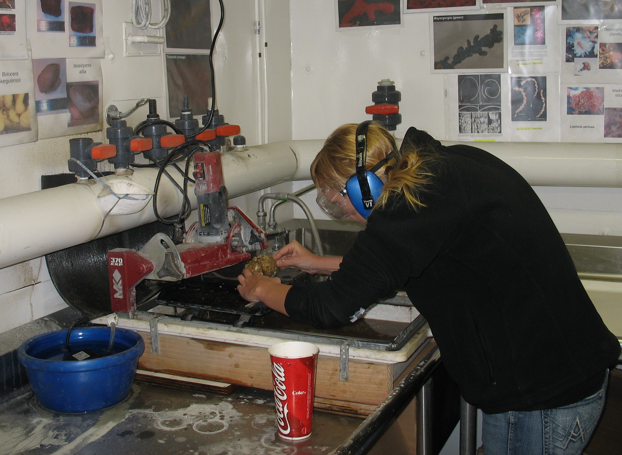 Katie Pena uses the wet rock saw to cut the rocks into smaller samples. Aboard the Nathaniel B. Palmer in the Drake Passage in the South Atlantic Ocean.