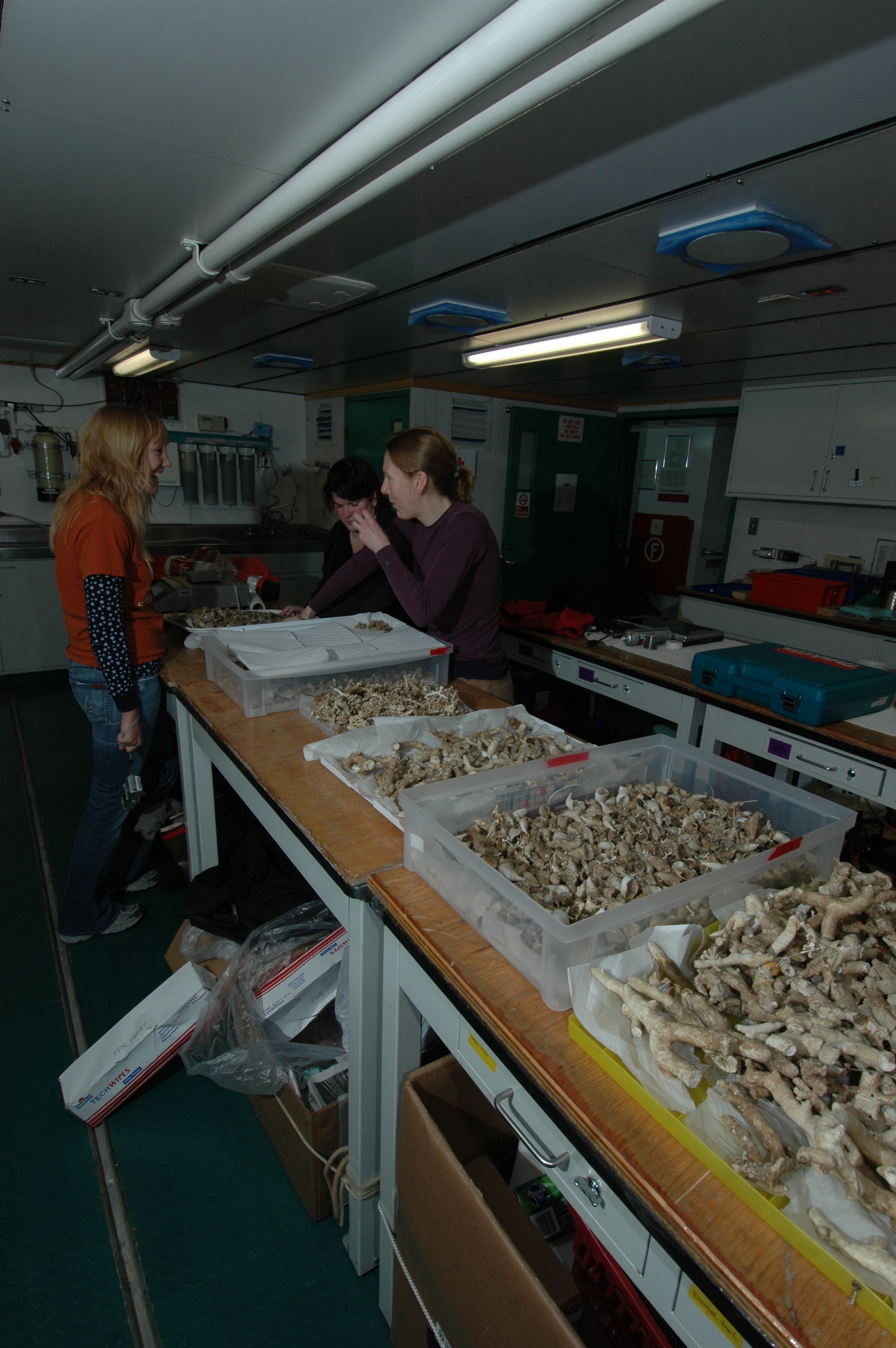 Laura is teaches Katie Pena the properties of the different corals so that she can help sort them. Aboard the Nathaniel B. Palmer in the Drake Passage in the South Atlantic Ocean.