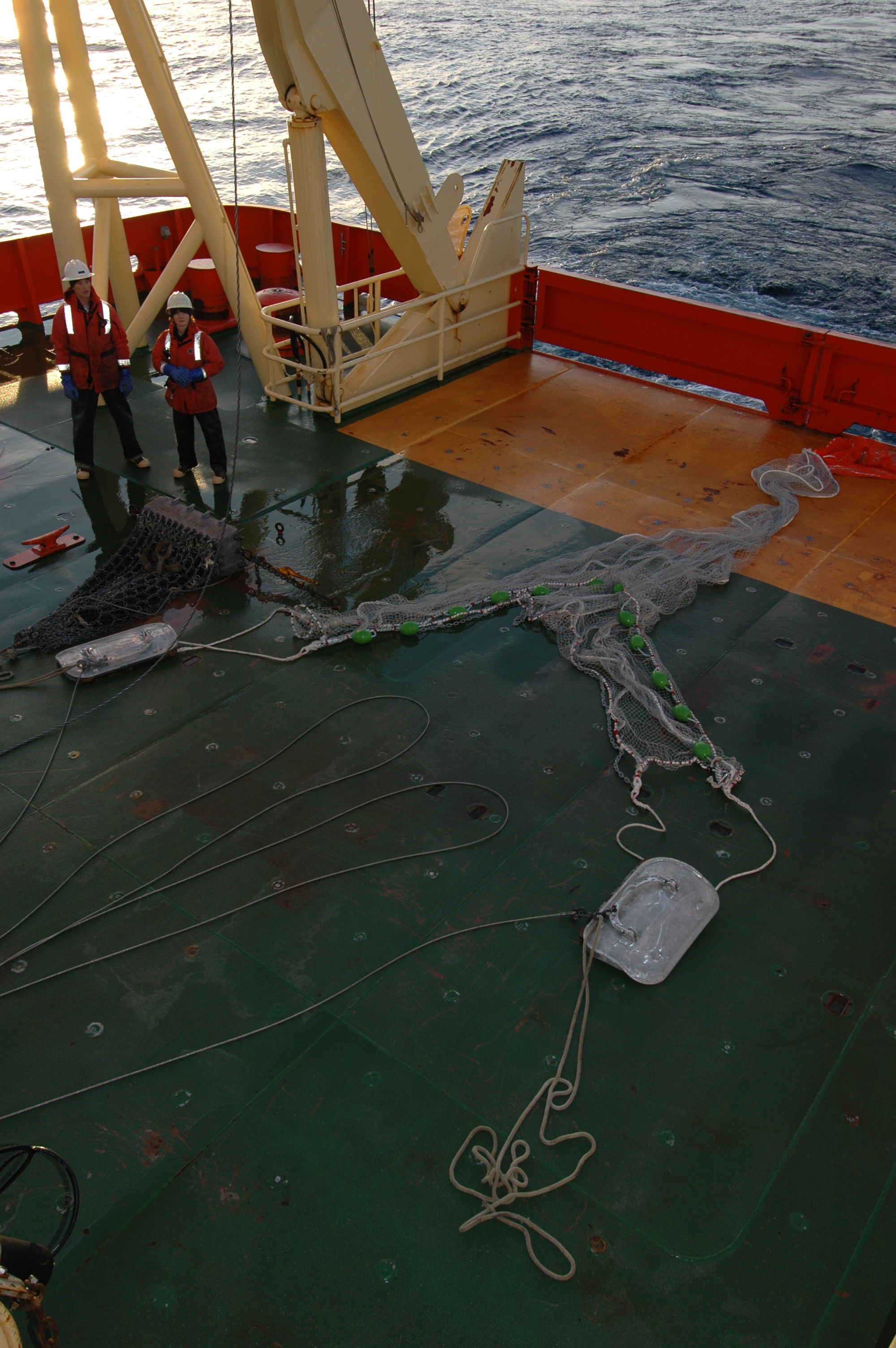 The otter trawl lying on the back deck. Aboard the Nathaniel B. Palmer in the Drake Passage in the Southern Ocean.