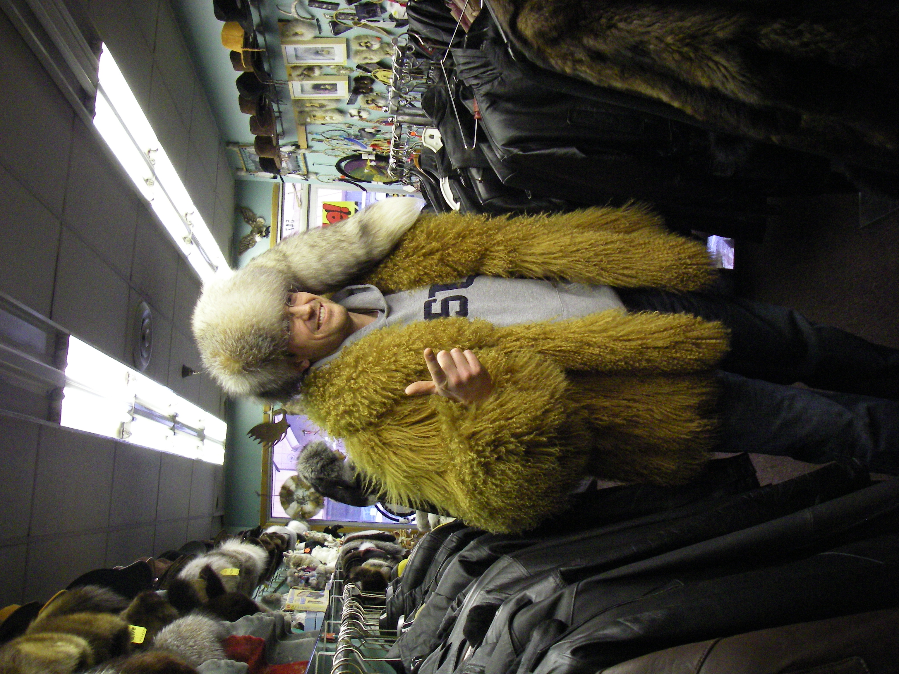 PolarTREC teacher Craig Beals modeling fur in Fairbanks, Alaska.