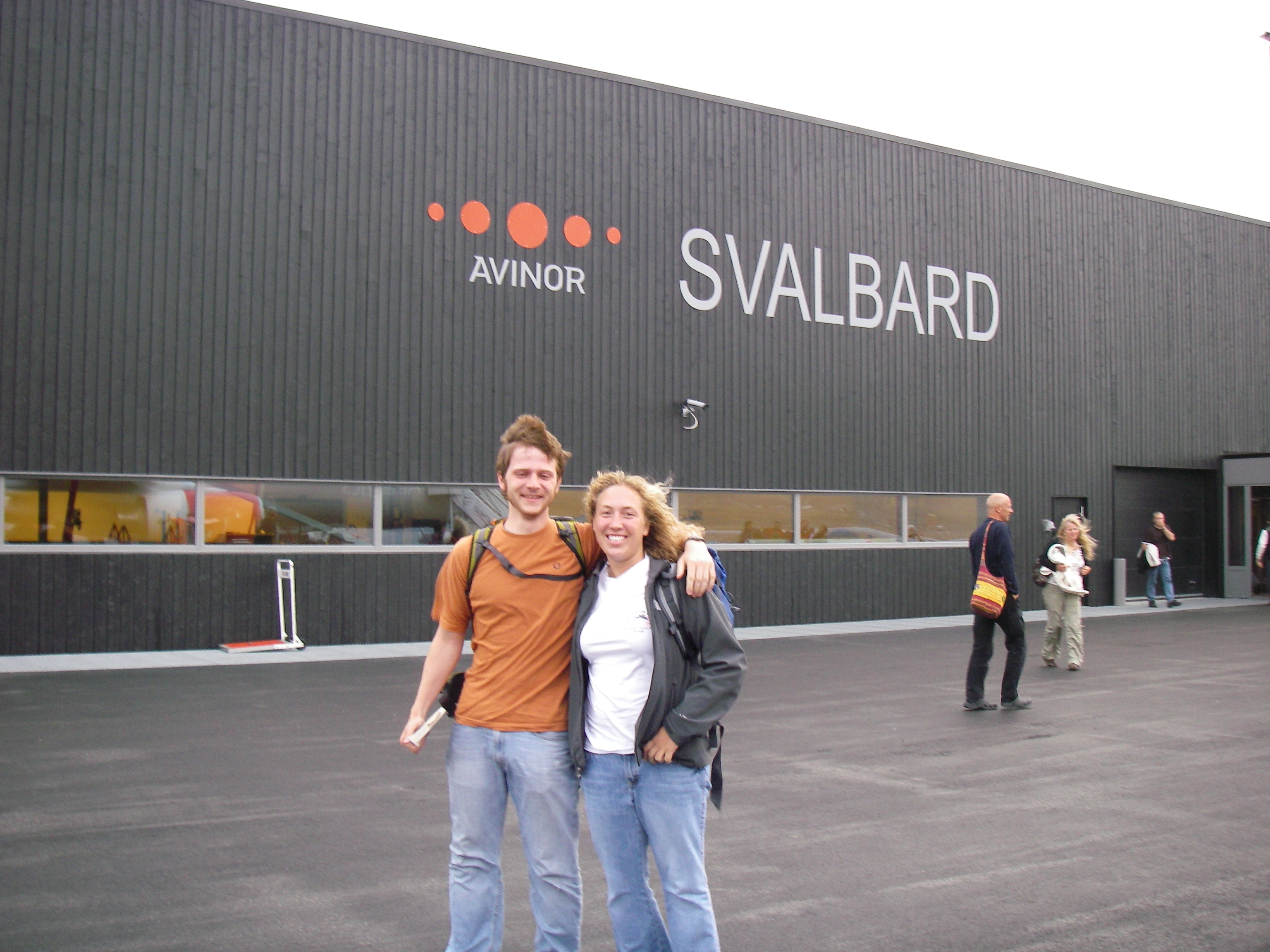 Missy Holzer says, "Dave Pompeani and Kristen Mitchell are all smiles even though they were standing in freezing rain!" Longyearbyen, Svalbard, Norway.