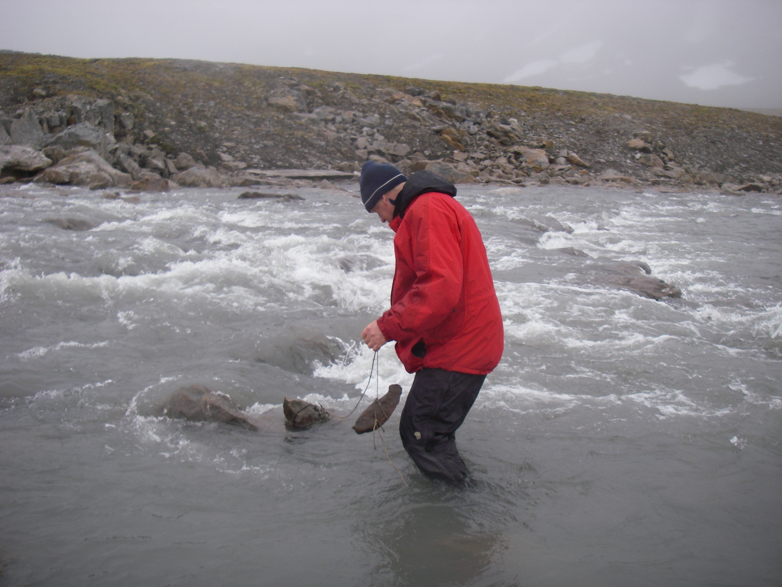 Mike Retelle tosses the temperature logger back into the stream after the data was collected. Kapp Linne, Svalbard, Norway.