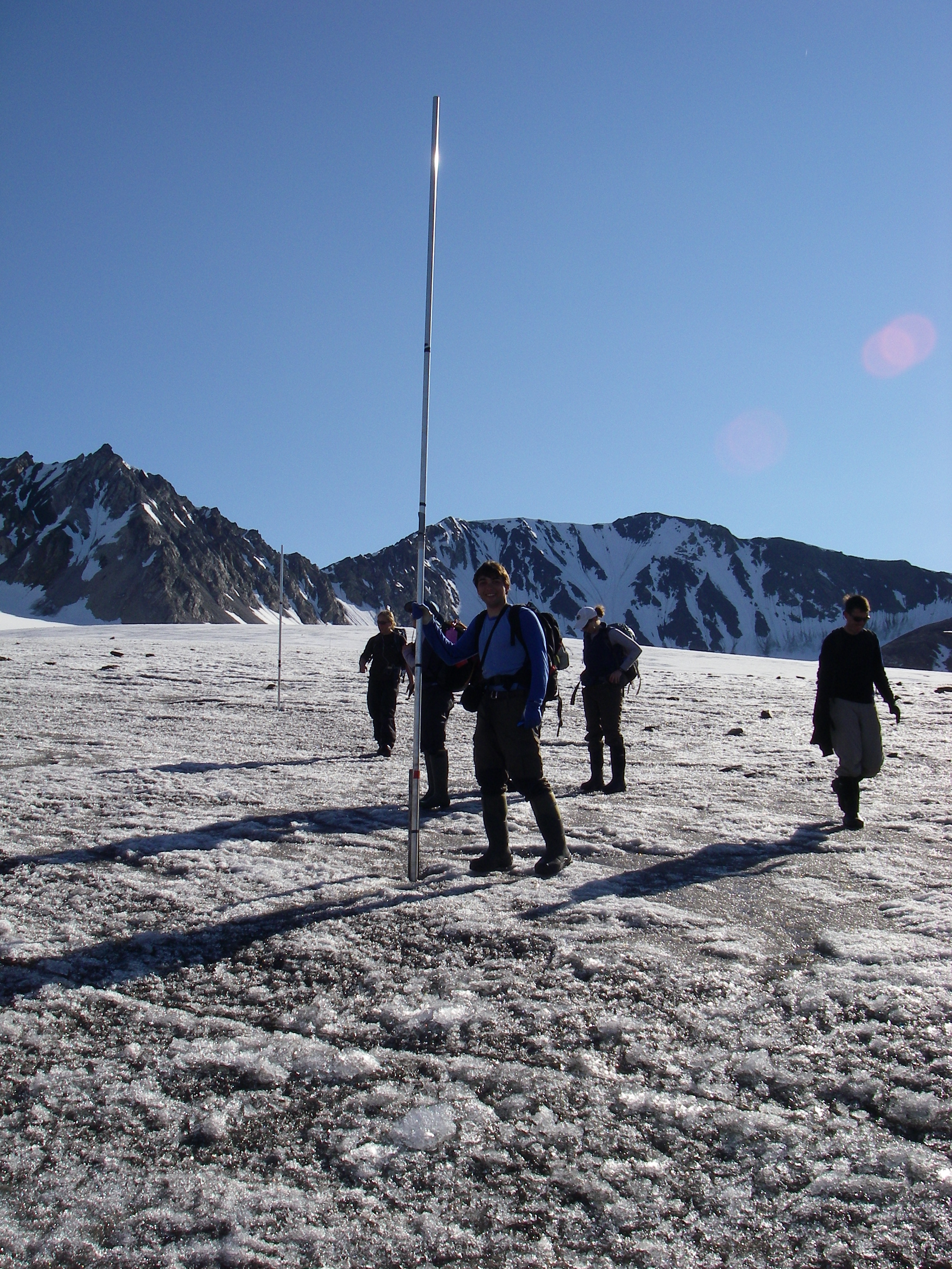 Leo Sold stands next to an ablation stake on Linne Glacier. Linne Valley, Svalbard, Norway.