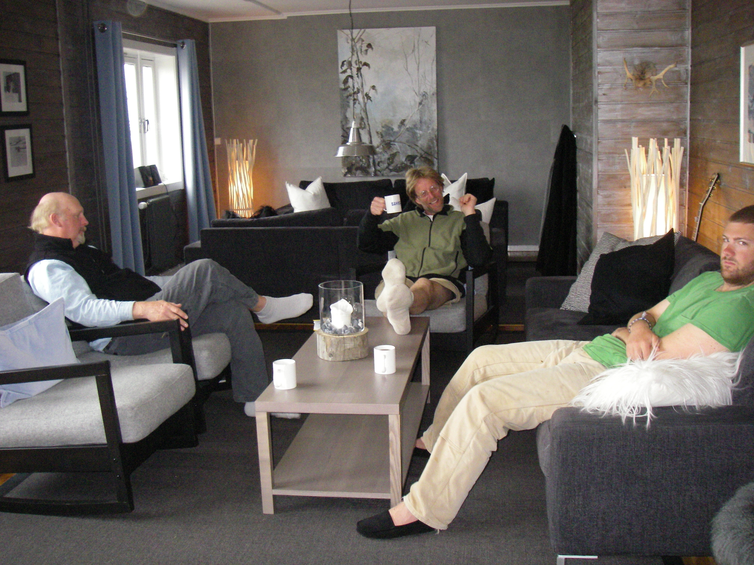Mike Retelle, Al Werner, and Jesse Burrows relax in the living room of the main building. Kapp Linne, Svalbard, Norway.