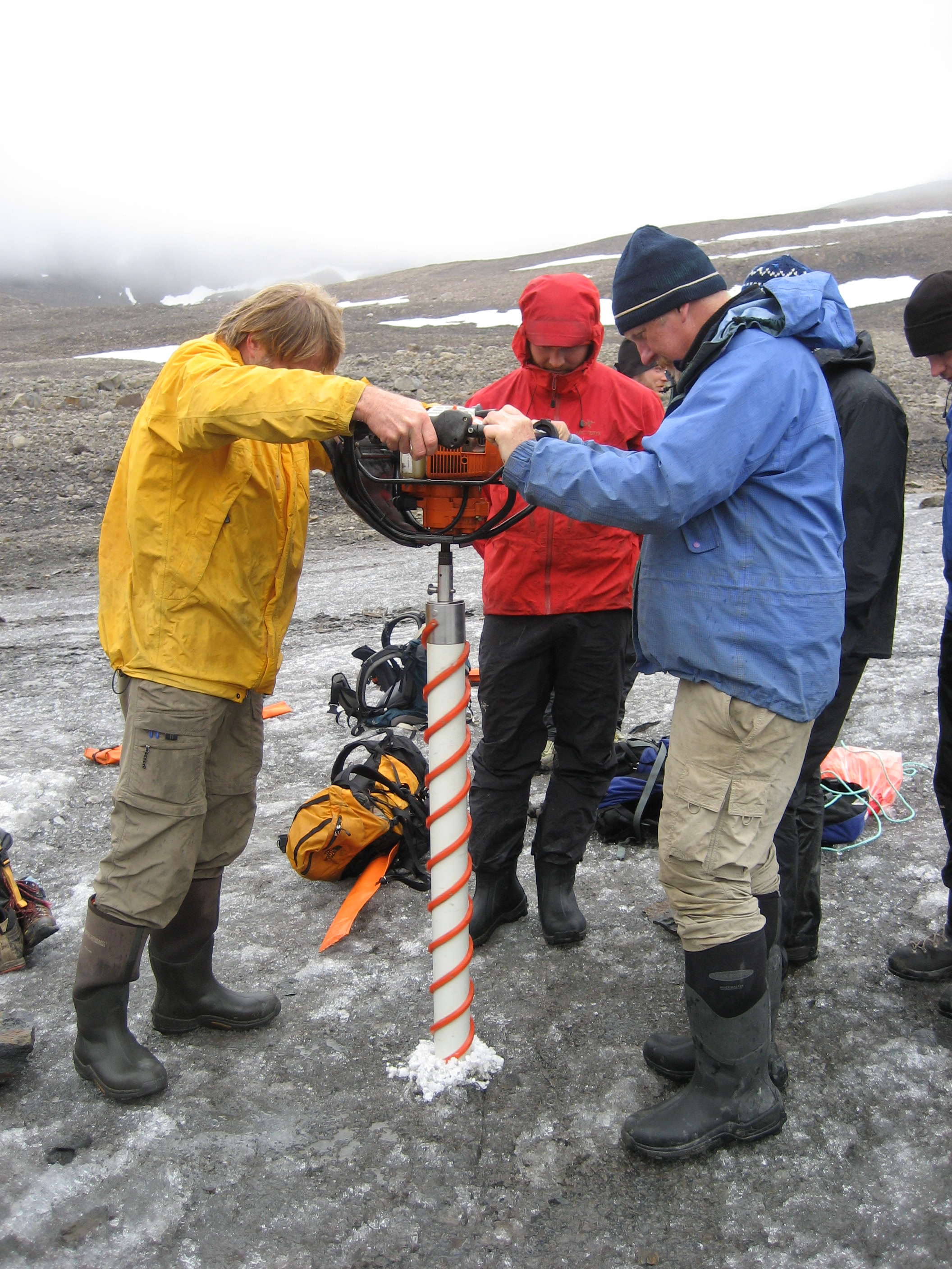 Al Werner and Mike Retelle provide the coring team with a lesson on how to use the ice corer. Linne Valley, Svalbard, Norway.