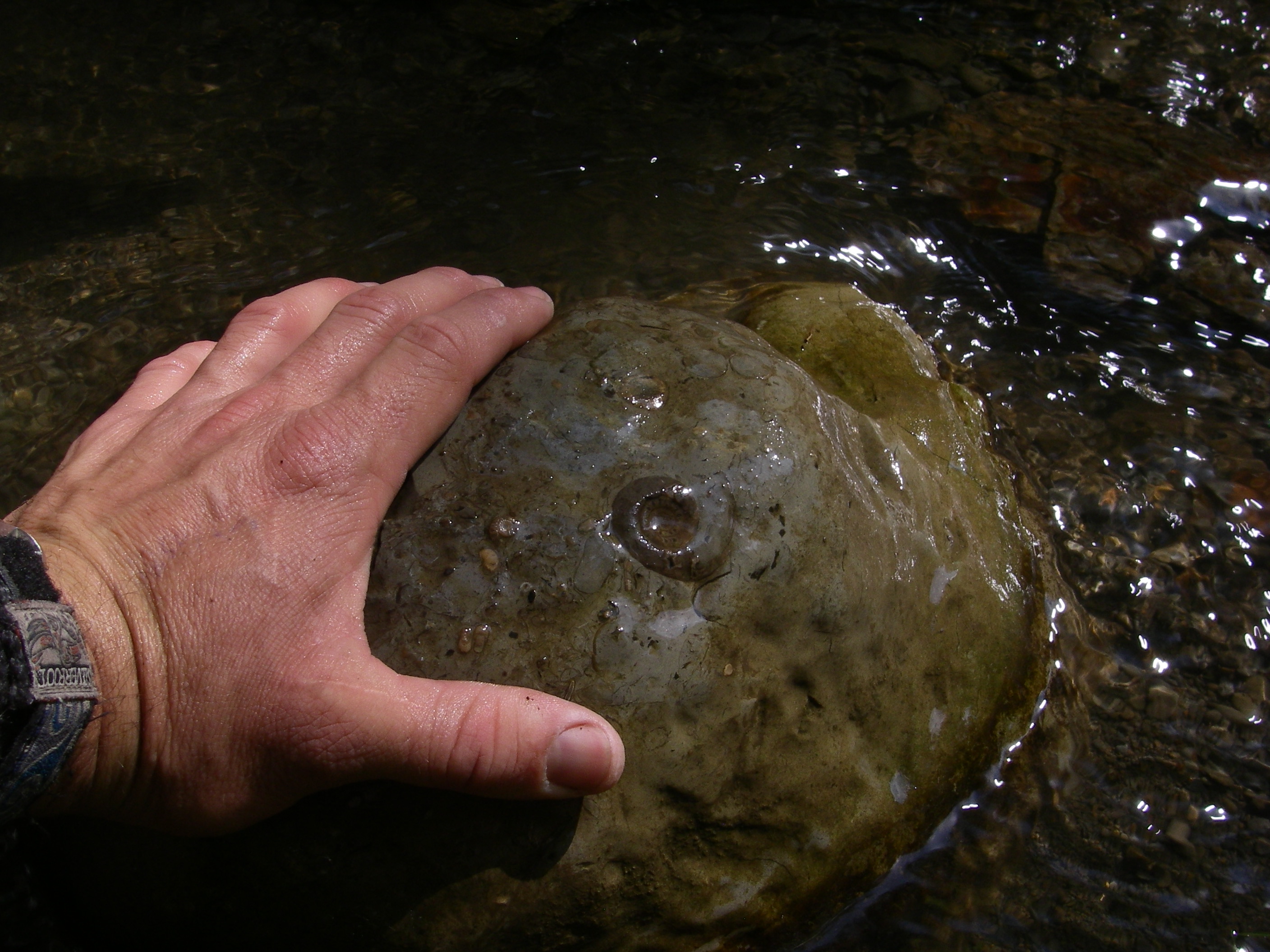 Dr. Michael Etnier's hand rests on a rock containing fossil ammonites. These fossils date to the Upper Cretaceous (65-90 million years ago). Sinegorsk, Sakhalin Island, Russia.