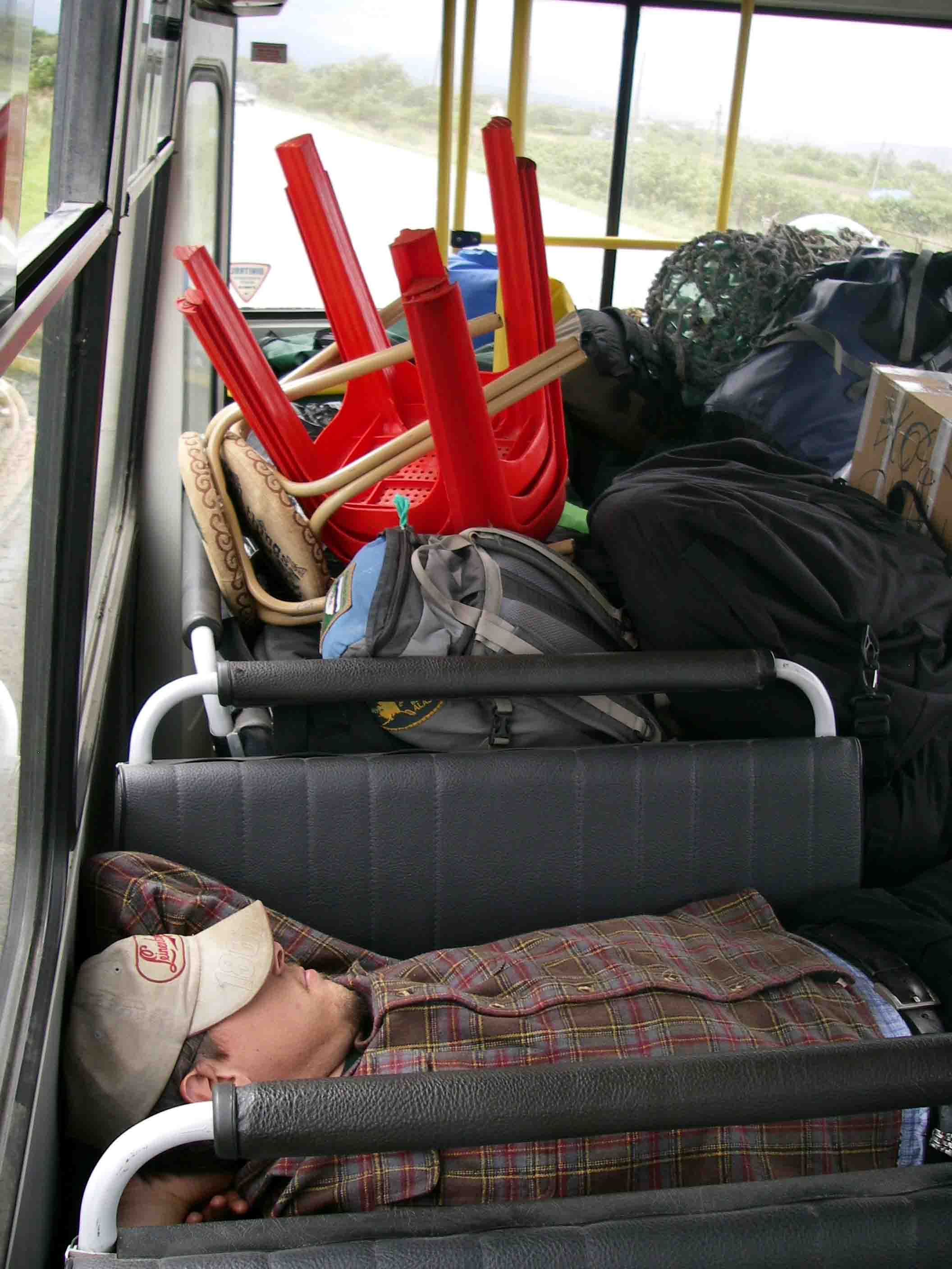 Erik Gjesfeld relaxes on the broken down bus, along with a large pile of equipment, personal gear, and souvenirs (a pair of very large glass floats is visible against the back window of the bus, partially wrapped in mesh netting). Korsakov, Sakhalin Island, Russia.