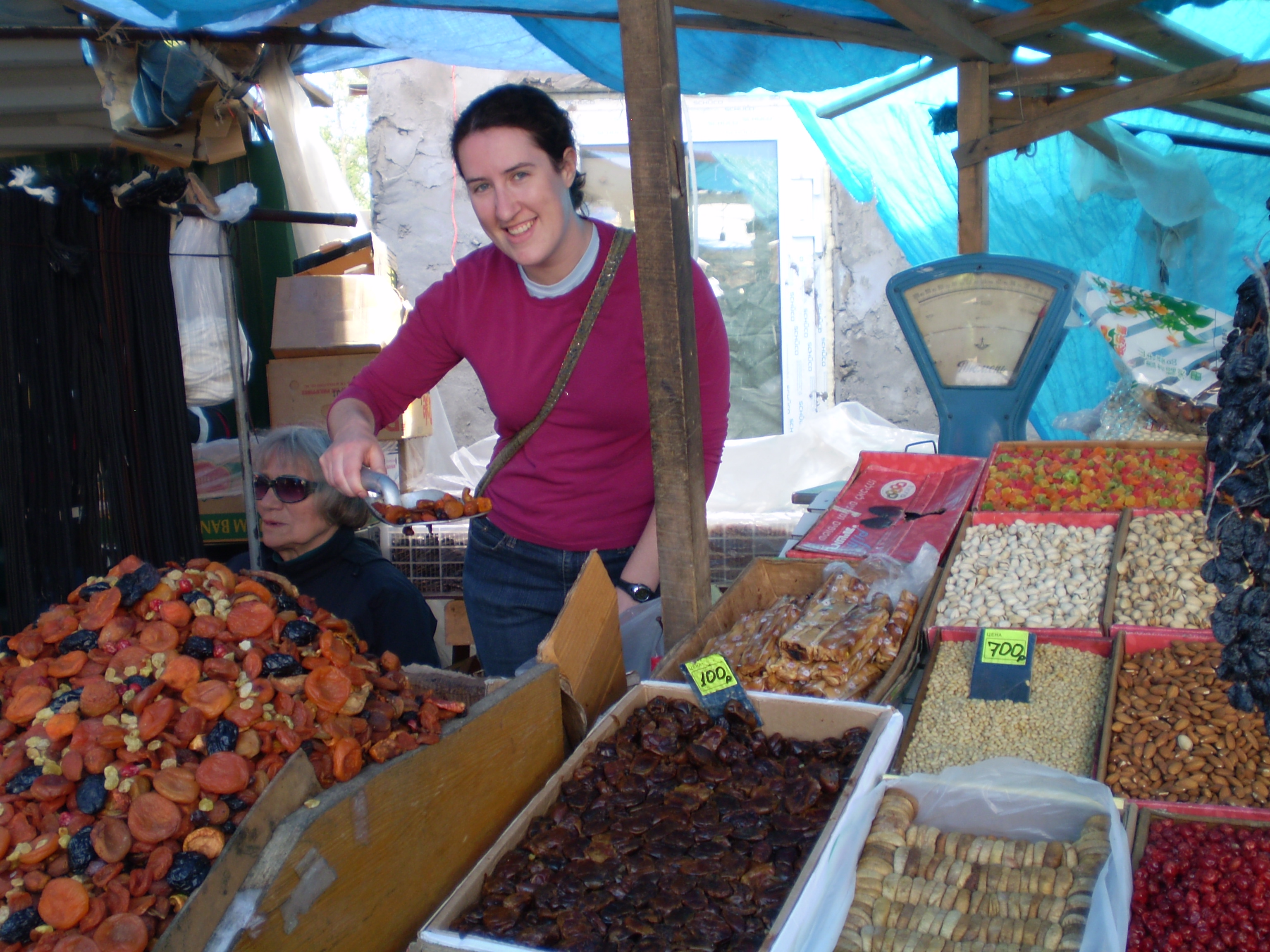 Misty Nikula: "Molly Odell convinced the dried fruit stand vendor to let her scoop her own dried fruit." Yuzhno-Sakhalinsk, Sakhalin Island, Russia.