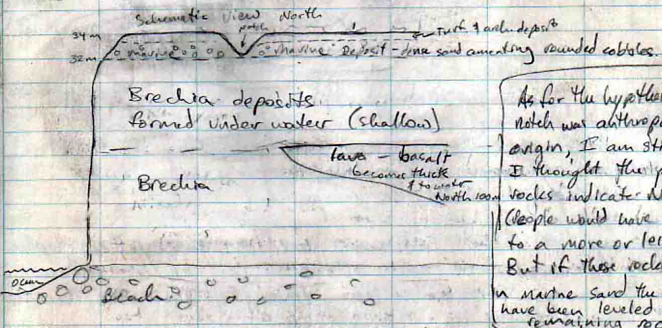 Schematic drawing of the team's interpretation of the stratigraphy in the bedrock of the promontory at the “notch” at Drobnyye. Shiashkotan Island, Kuril Islands, Russia.