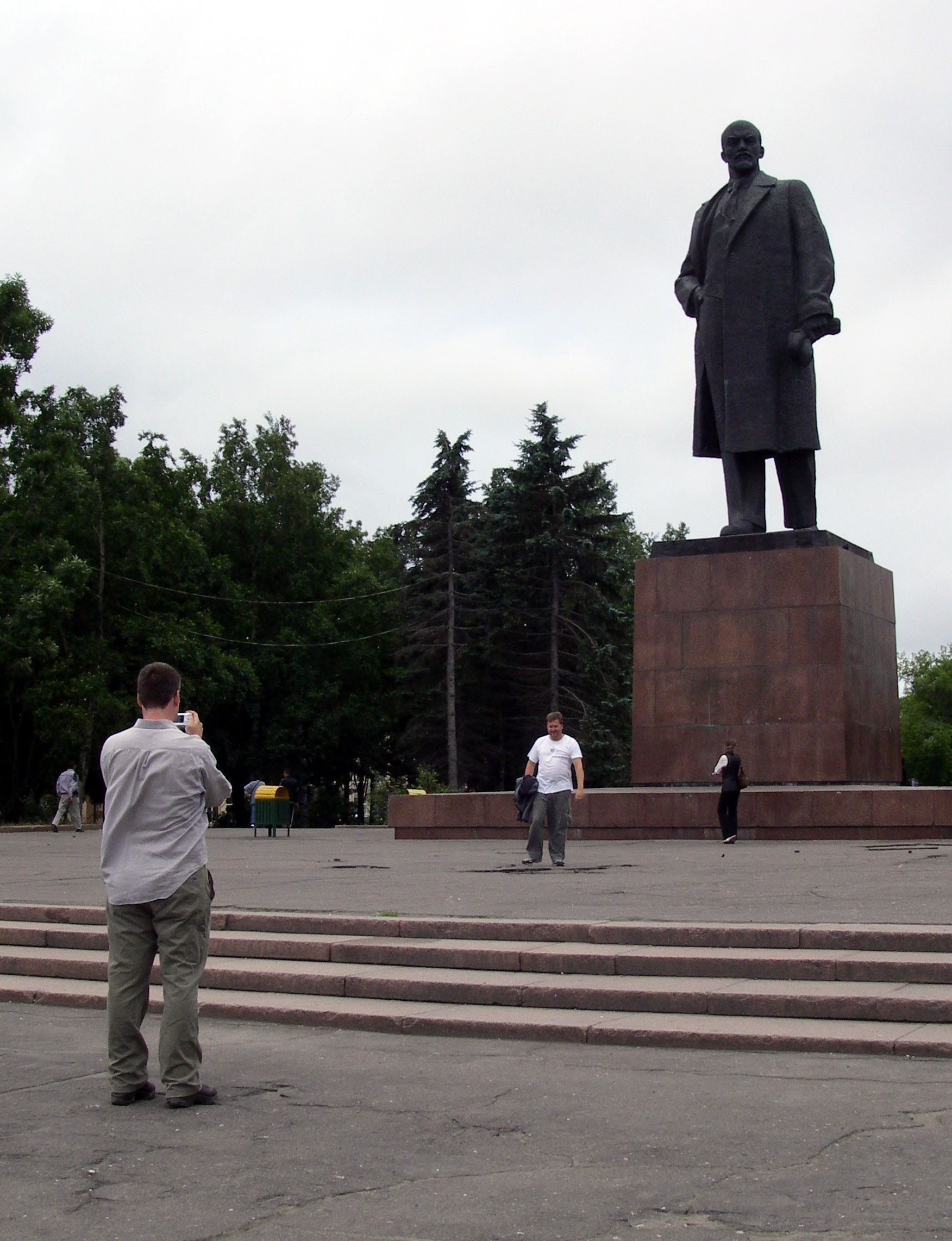 Erik Gjesfeld (UW Archaeology graduate student) takes a photo of Douglas Querl (UW undergraduate student) in front of Lenin’s statue in Lenin Square. Yuzhno-Sakhalinsk, Sakhalin Island, Russia.