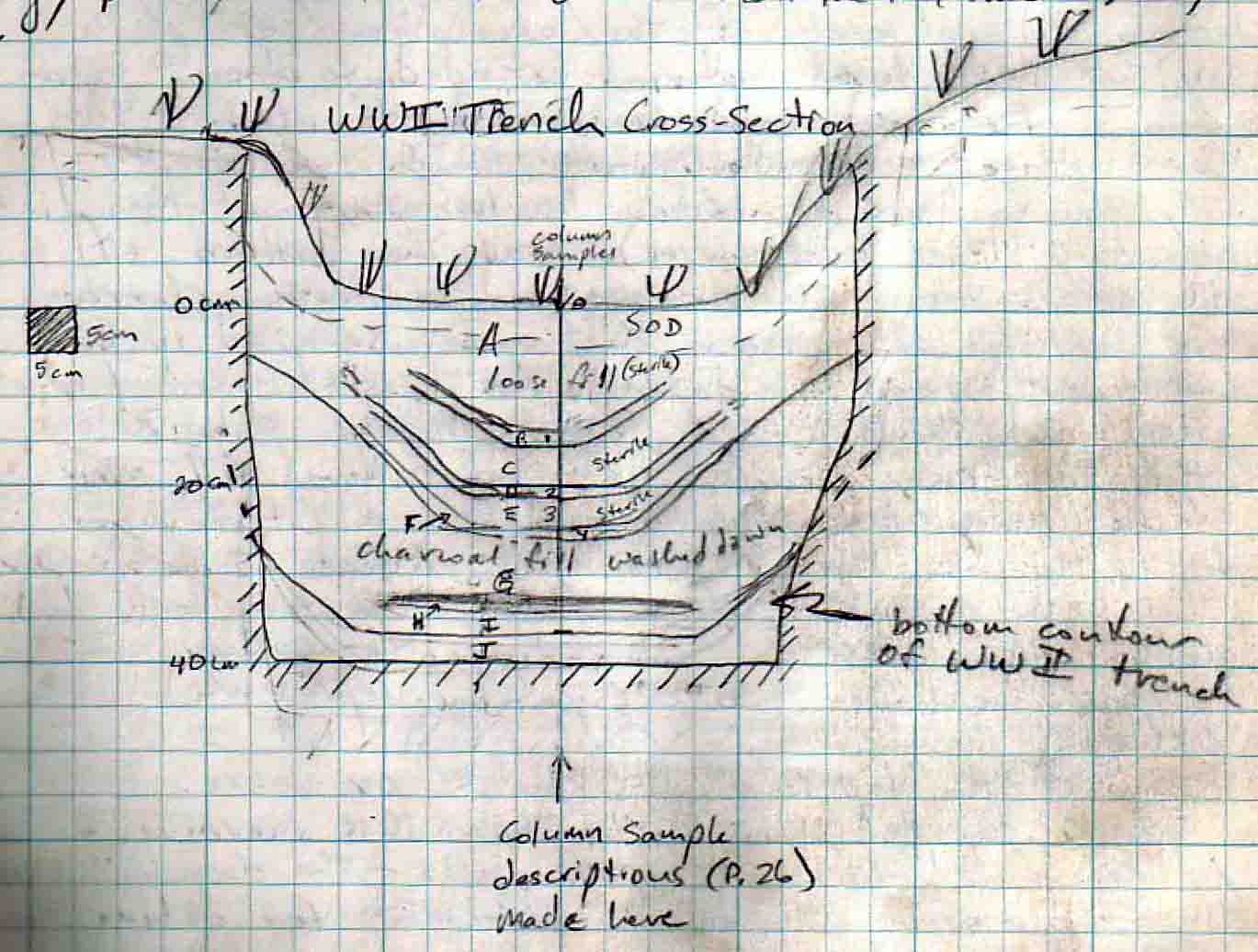 A schematic drawing of the team's interpretation of the tephra stratigraphy in an excavation of a military trench at Drobnyye. Shiashkotan Island, Kuril Islands, Russia.