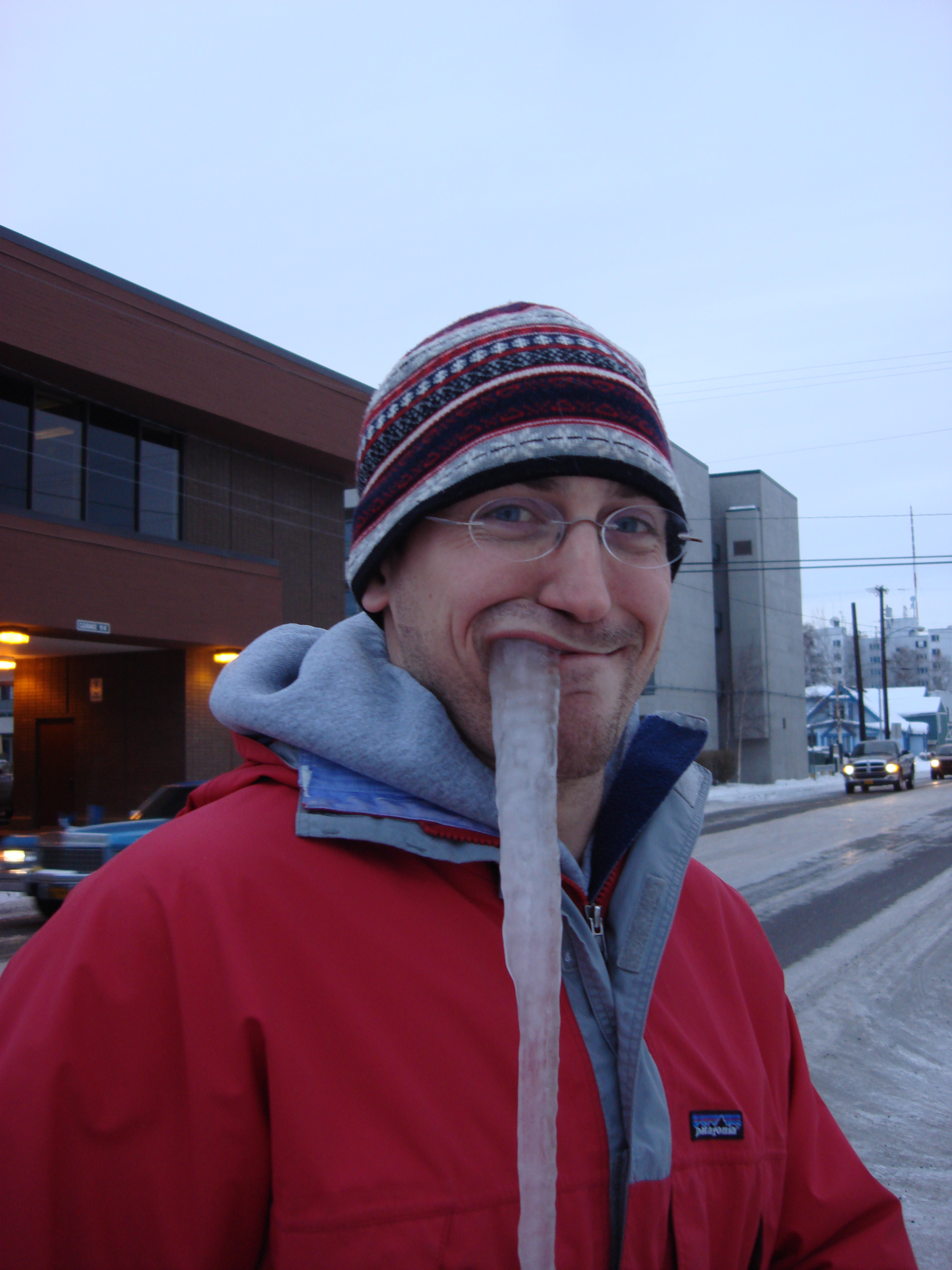 Craig Beals pretends to be a walrus. Outside the Westmark Hotel in Fairbanks, Alaska.