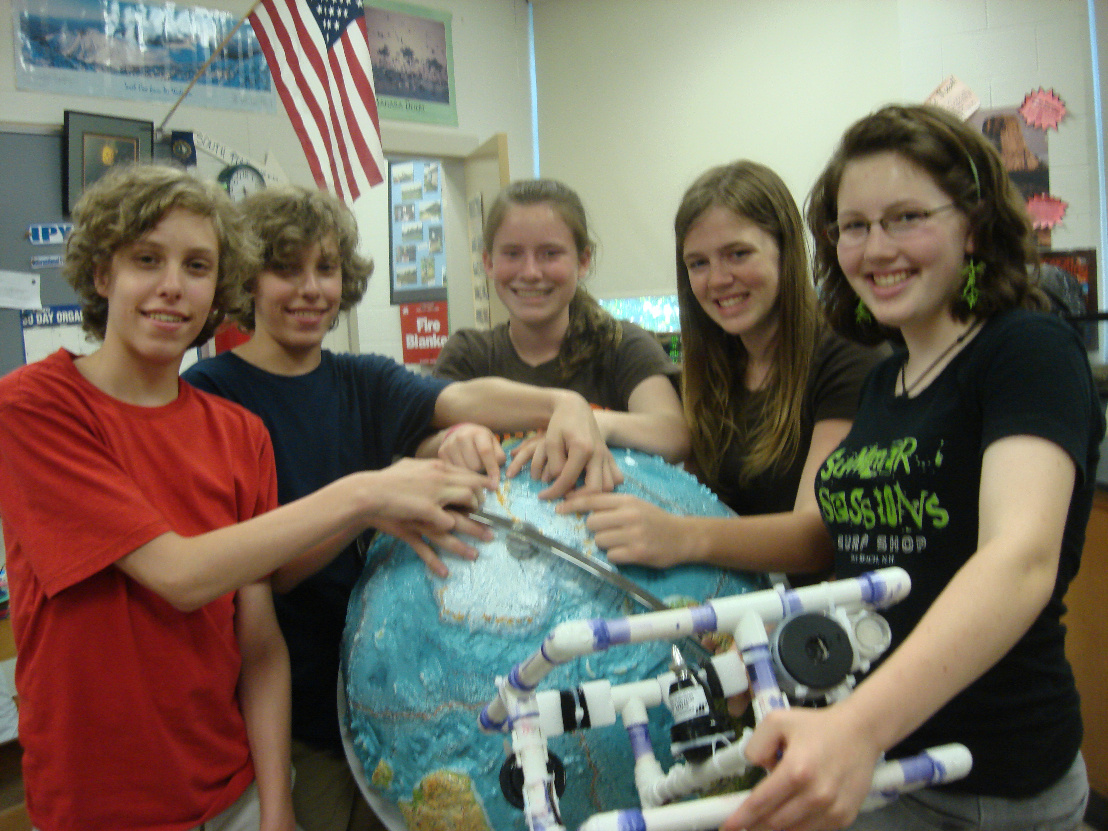 Some of the students from the robot group stand proudly with their underwater camera robot and point to Antarctica on the globe. At Rye Junior High in Rye, New Hampshire.