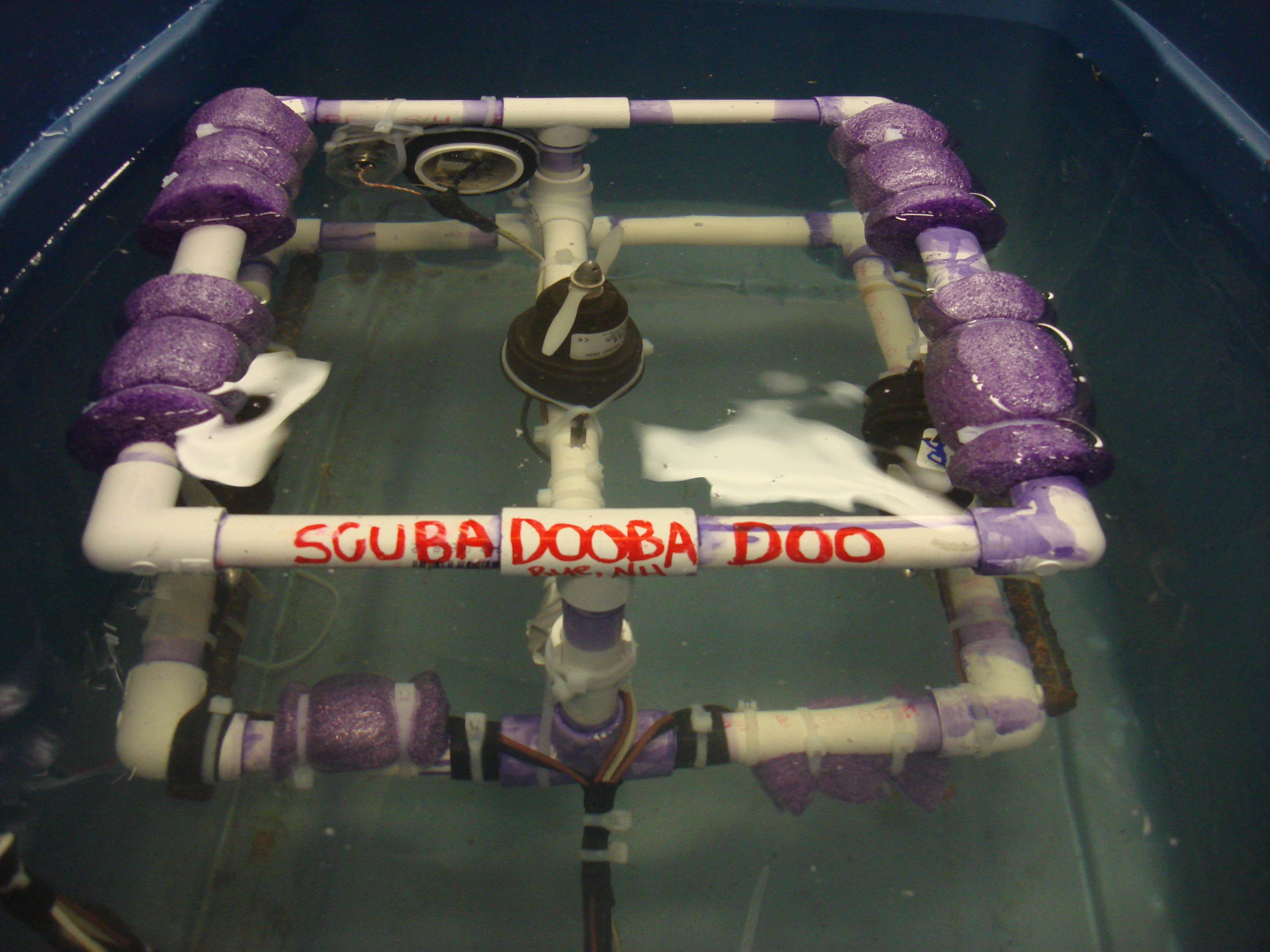 The students named the underwater camera robot "SCUBADOOBA DOO." After some modifications, the robot is neutrally buoyant once again. At Rye Junior High in Rye, New Hampshire.