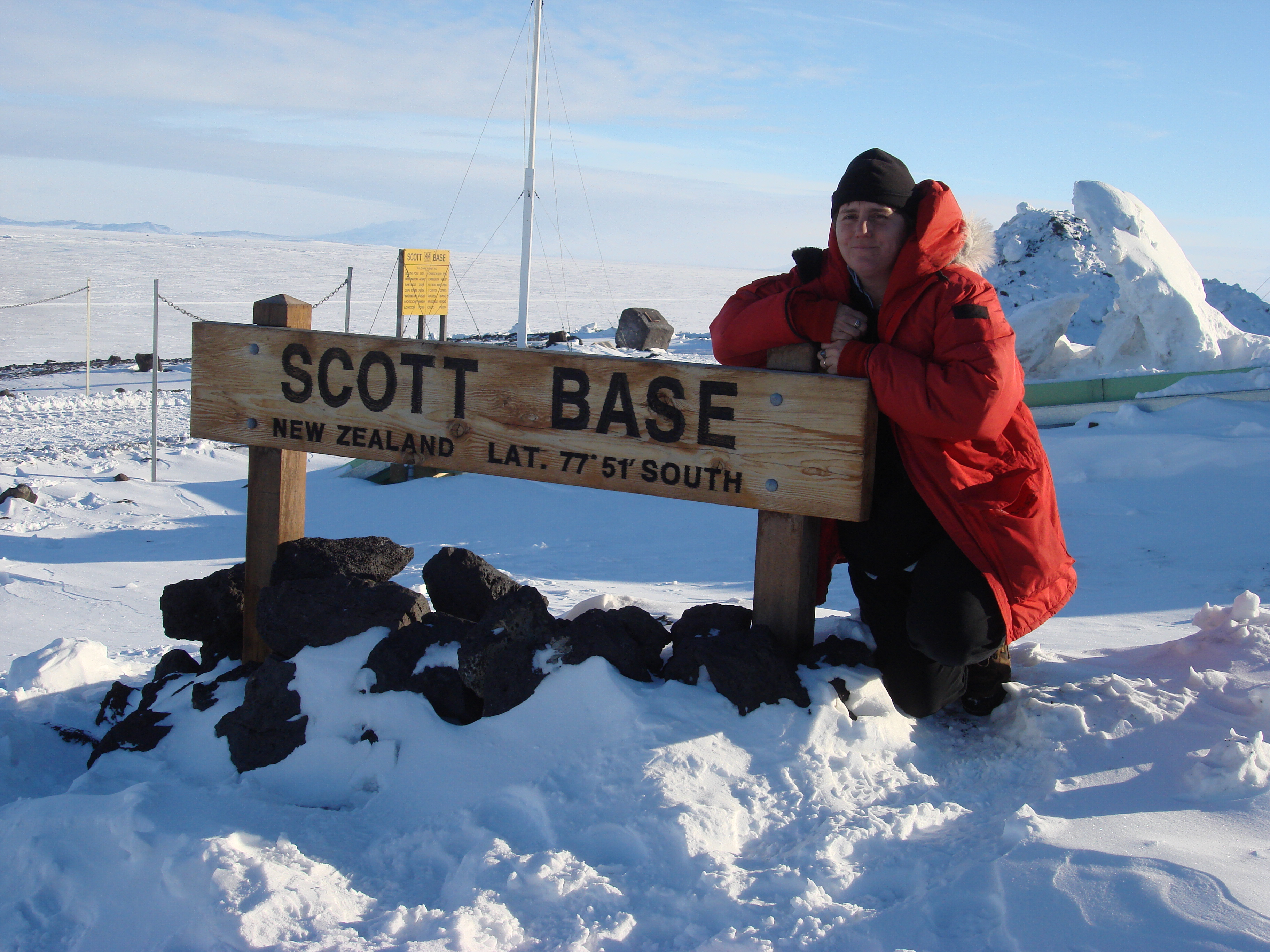 Robin Ellwood poses next to another Scott Base sign. Scott Base, Antarctica.