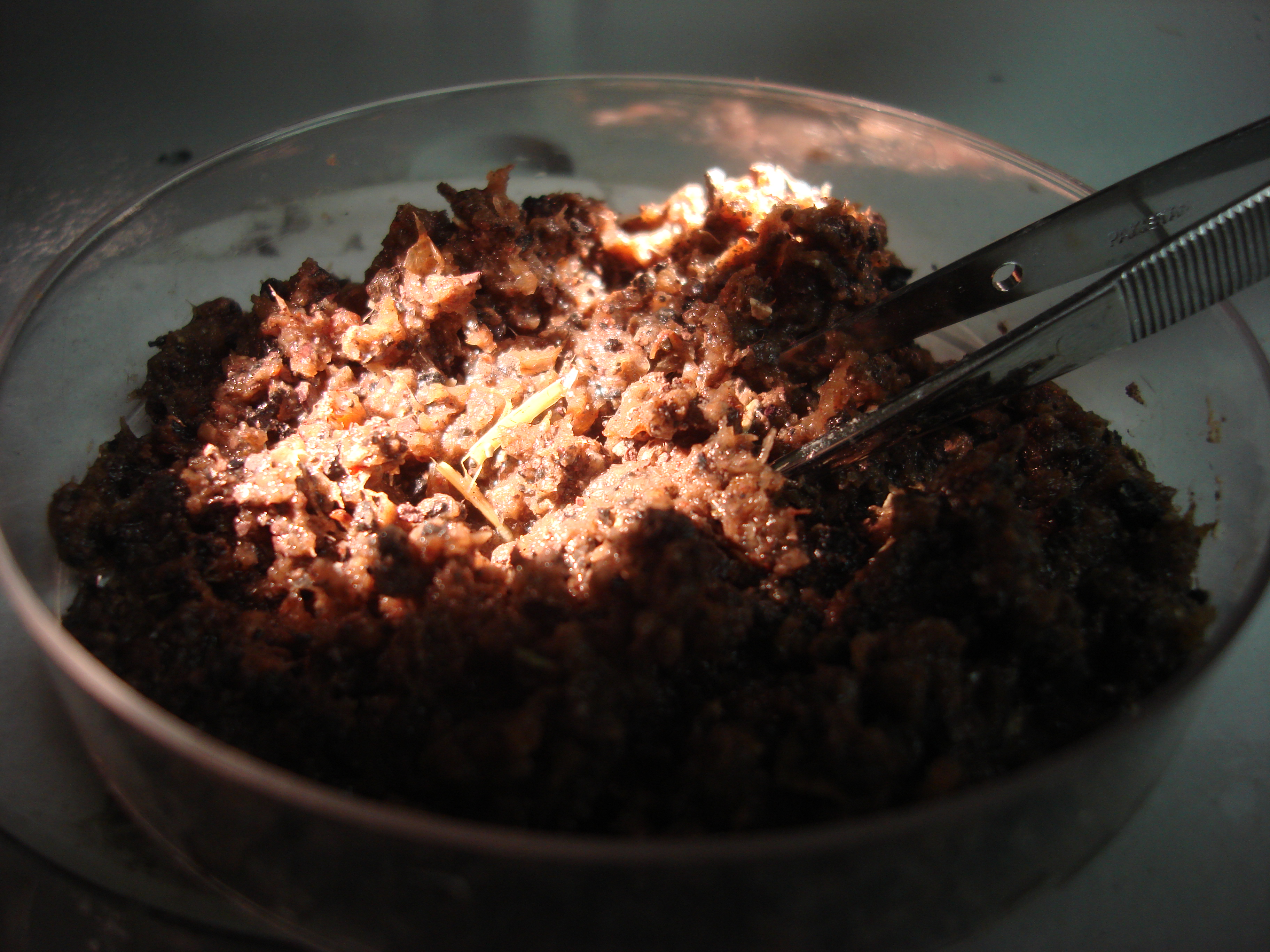 A petri dish containing a sample of penguin feces. McMurdo Station, Antarctica.