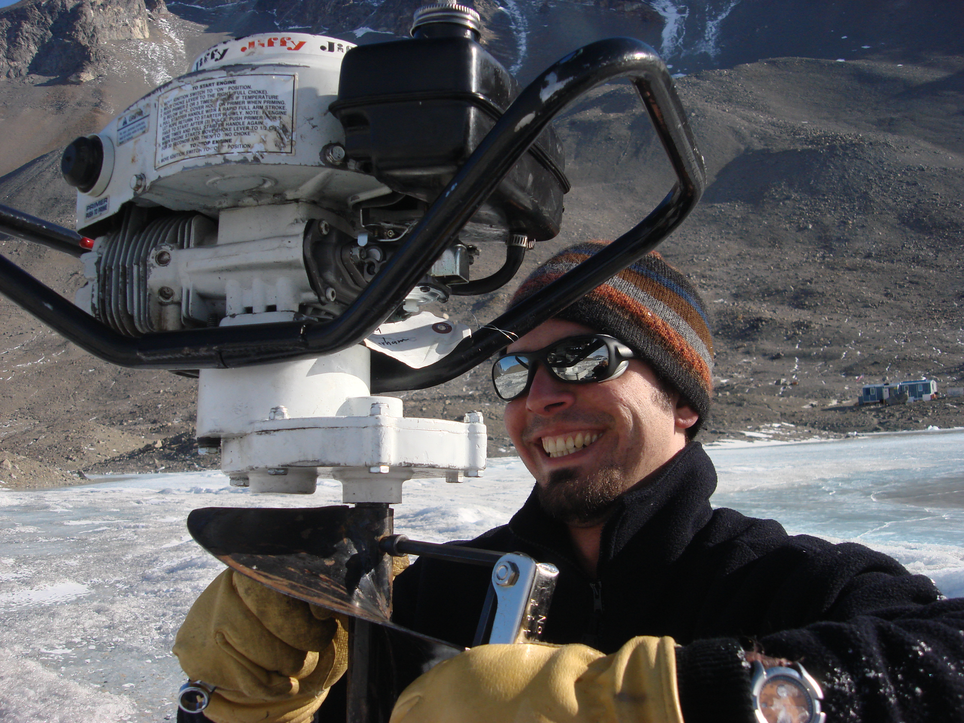 Maciej Obryk poses with a jiffy drill. Lake Hoare, Dry Valleys, Antarctica.