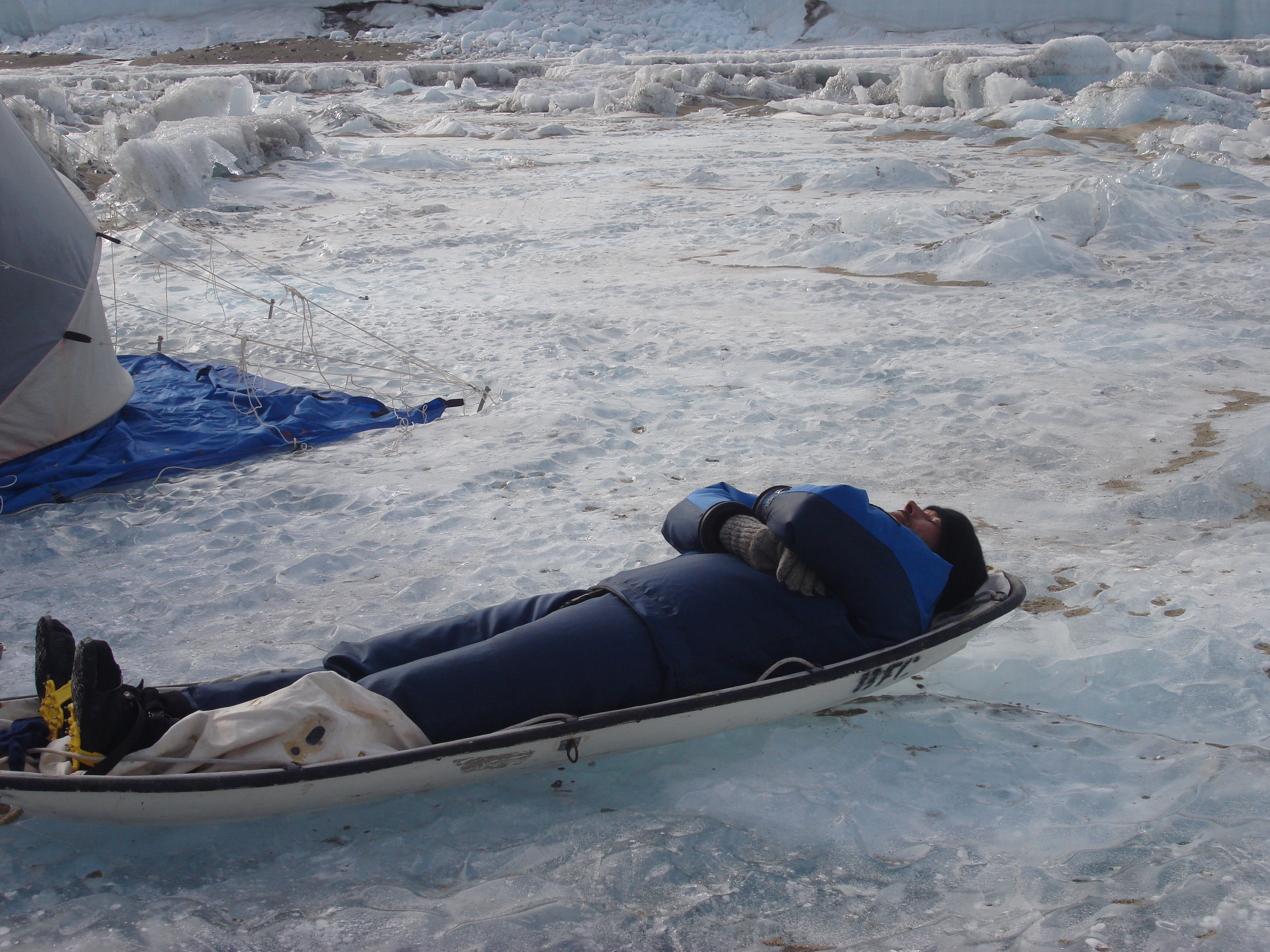 Ian rests in a banana sled. Lake Hoare, Dry Valleys, Antarctica.
