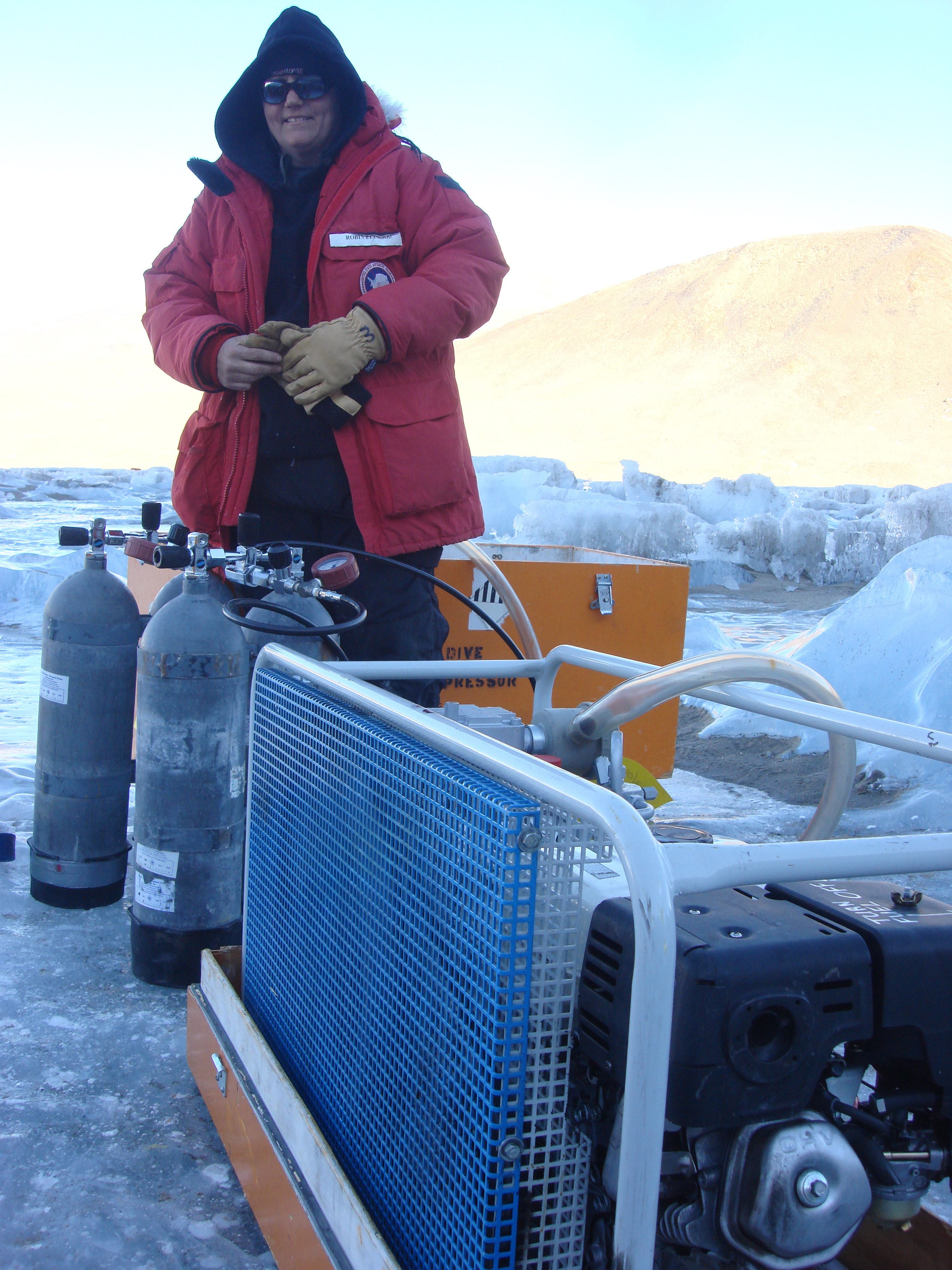 Robin Ellwood and the compressor. Lake Hoare, Dry Valleys, Antarctica.