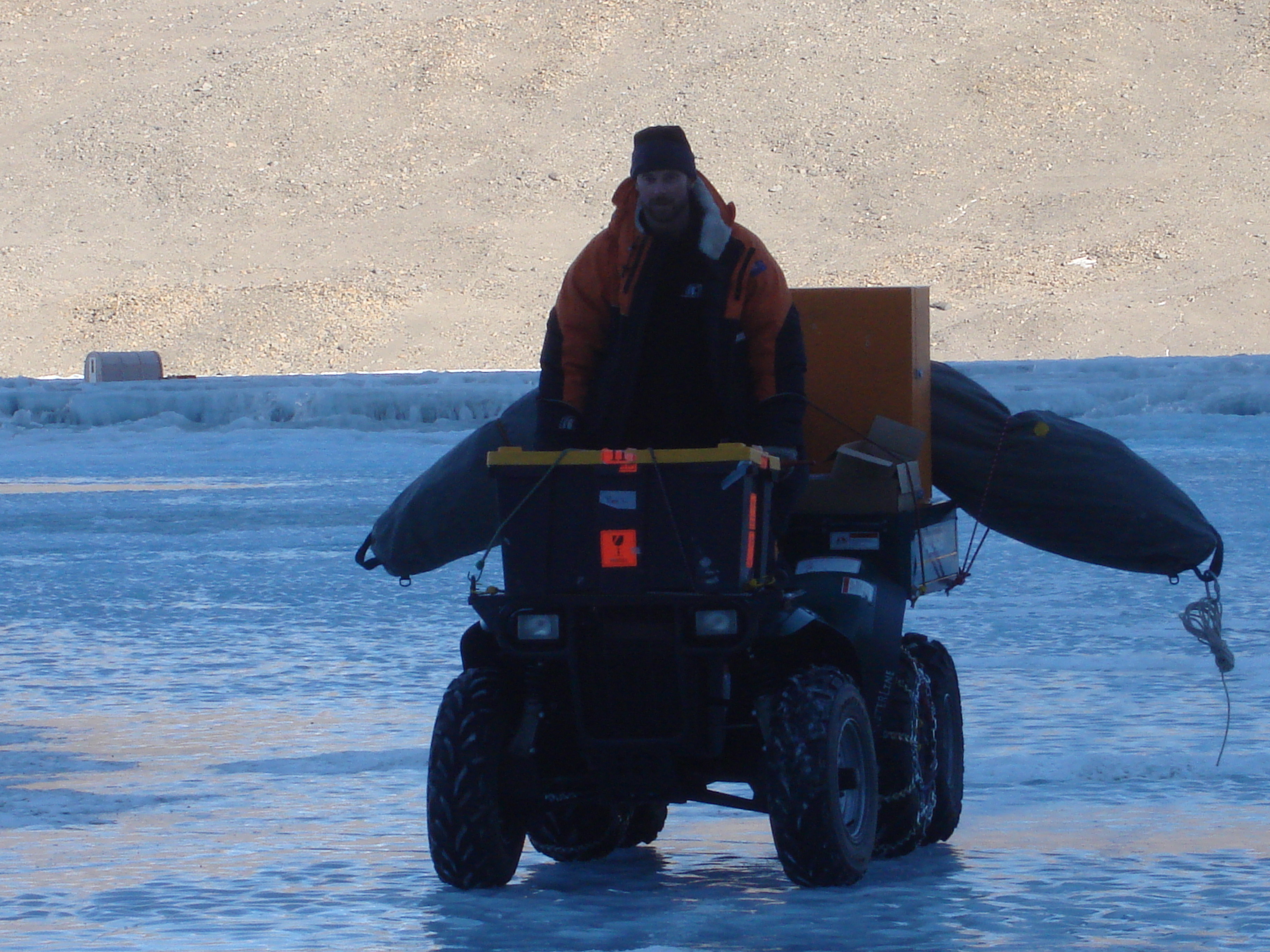 Aslan returns with some gear on an ATV. Lake Hoare, Dry Valleys, Antarctica.