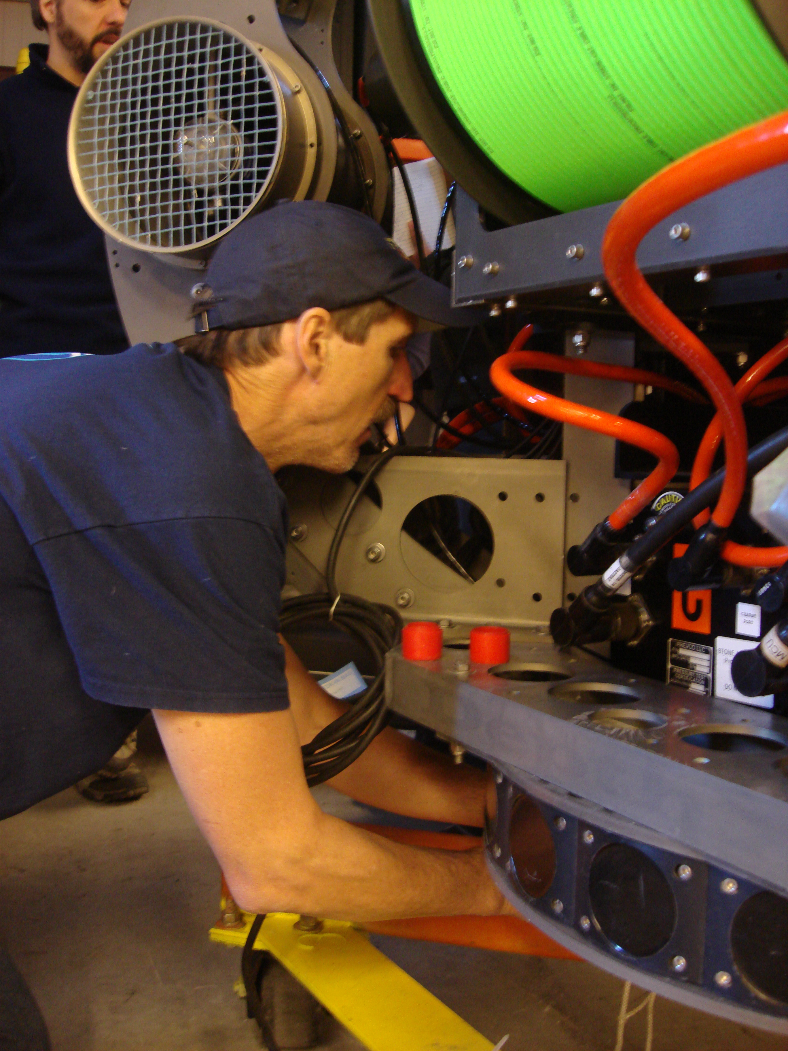 Bill works on the underside of the ENDURANCE autonomous underwater vehicle (Environmentally Non-Disturbing Under-ice Robotic ANtarctiC Explorer). McMurdo Station, Antarctica.