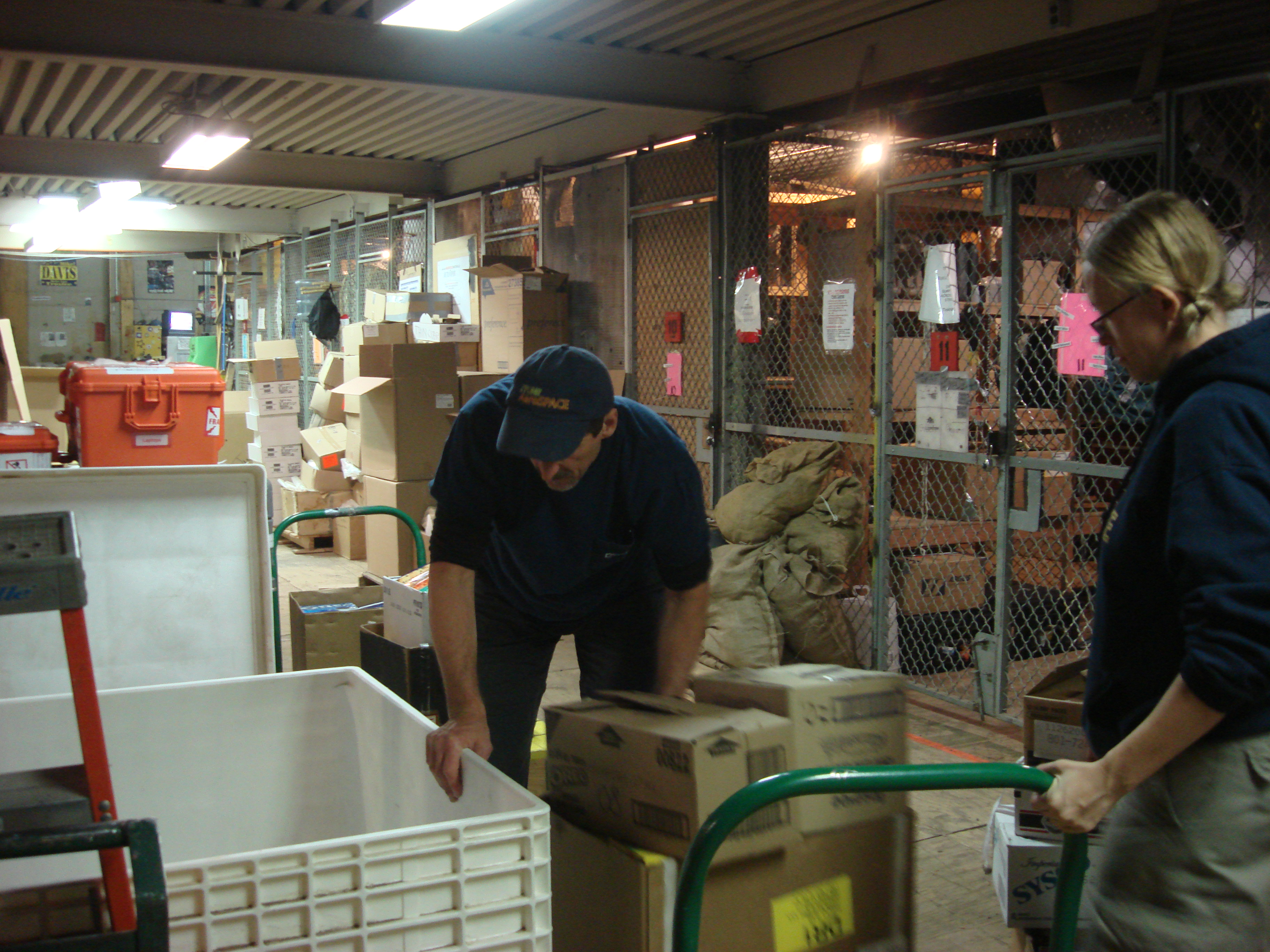 The team packs food into a white crate. McMurdo Station, Antarctica.