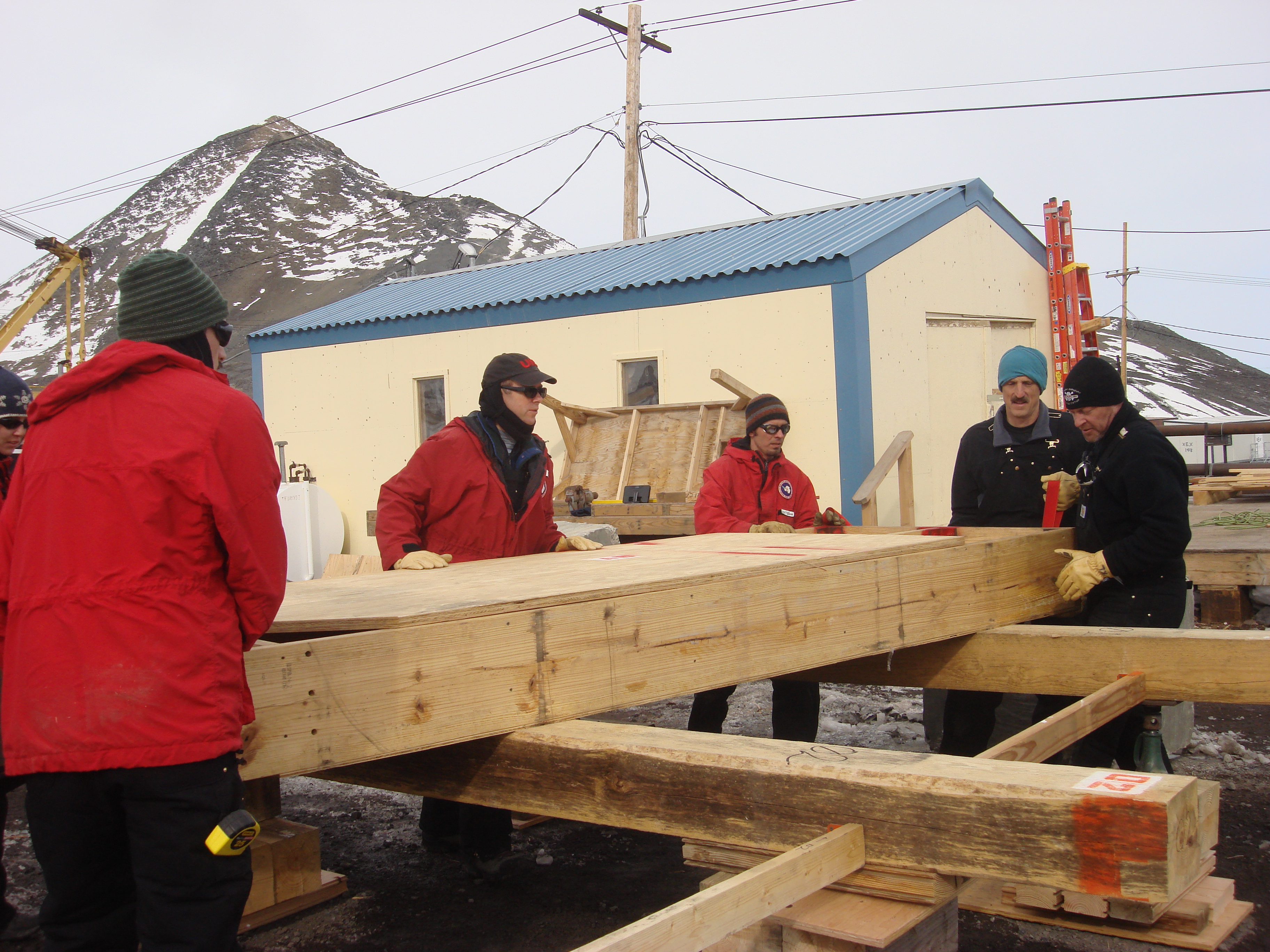 The team puts a 400 pound flooring section into place. McMurdo Station, Antarctica.