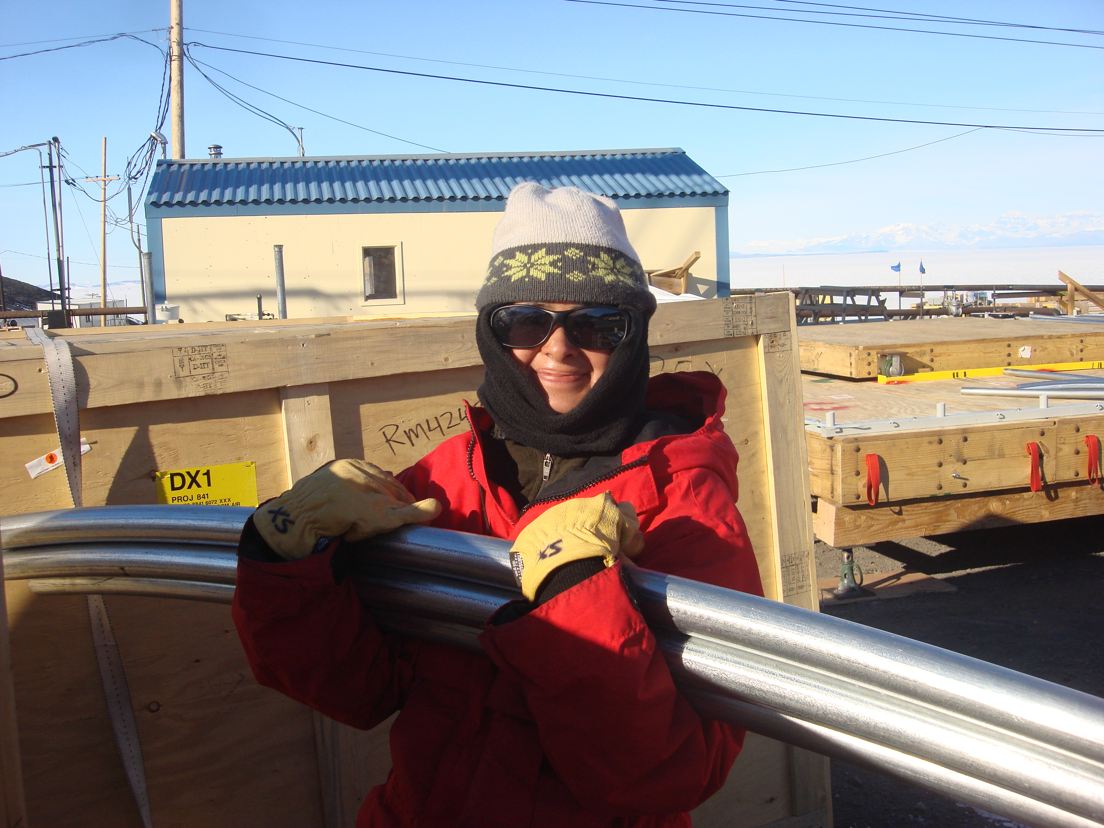 Shilpa carries a pile of "ribs" (crossbar supports) to the work site. McMurdo Station, Antarctica.