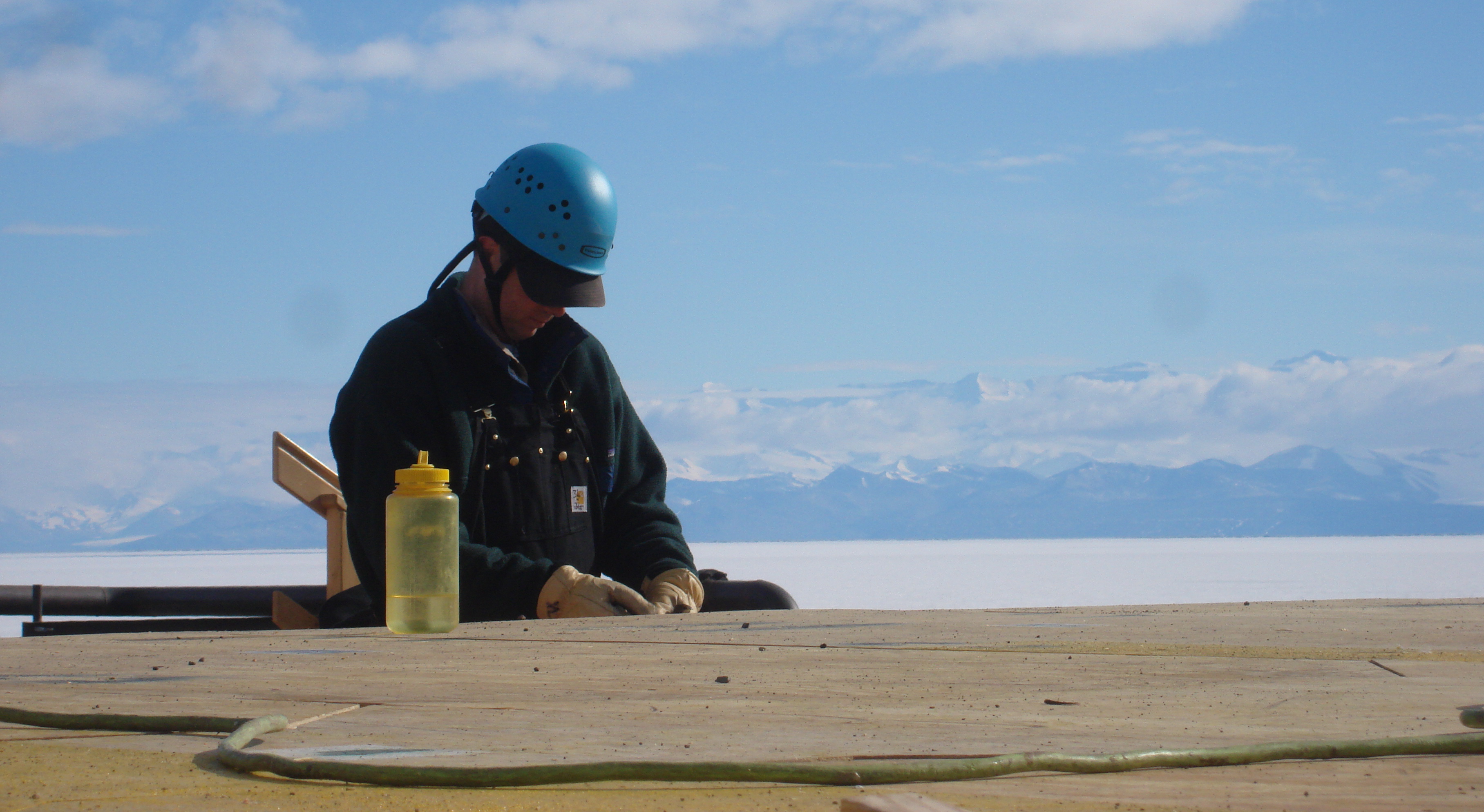 Peter Doran works with the Transantarctic Mountains in the background. McMurdo Station, Antarctica.