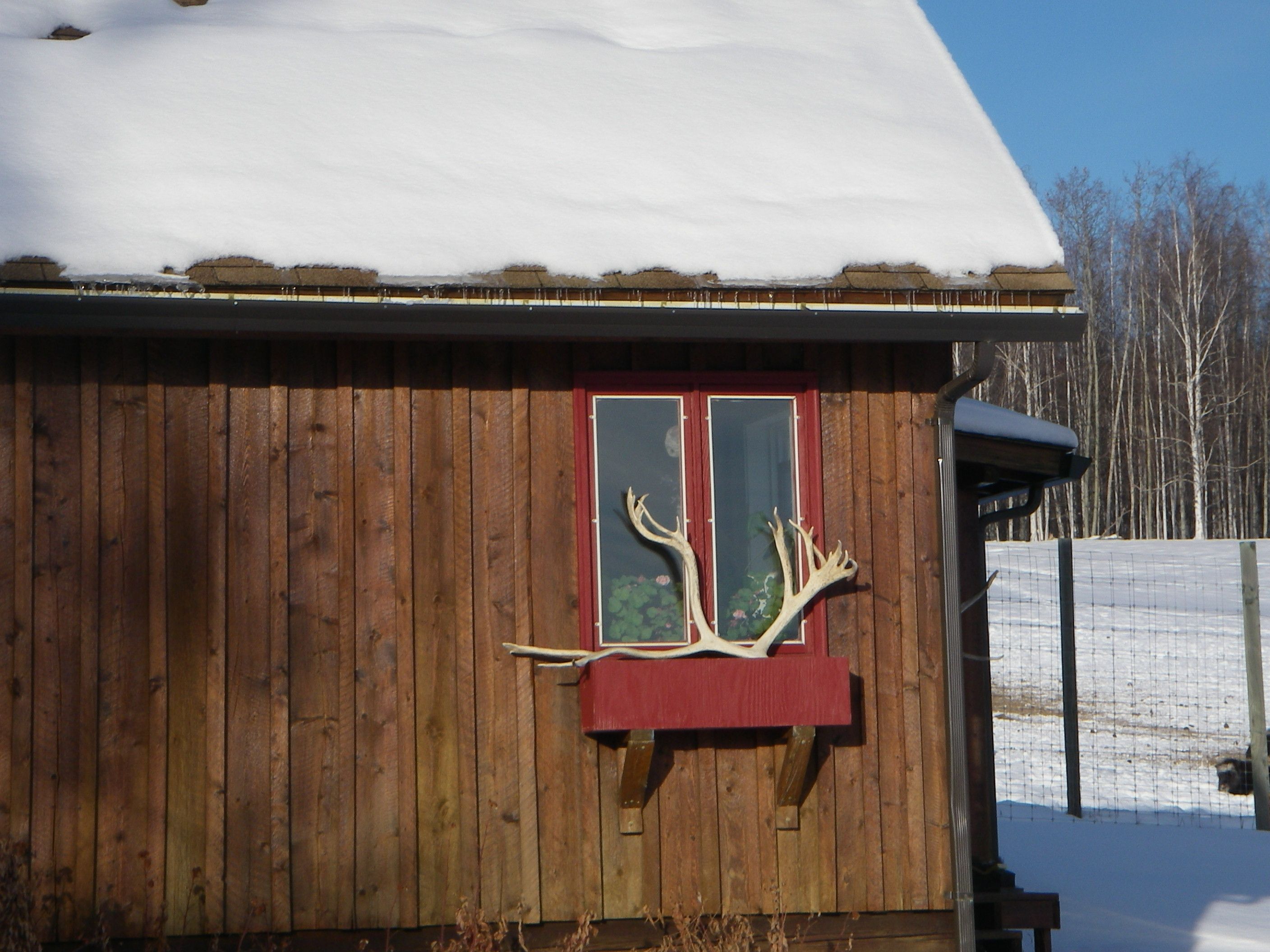 A cabin with a little late winter color and Alaskan décor provided by discarded antlers and red geraniums. Fairbanks, Alaska.