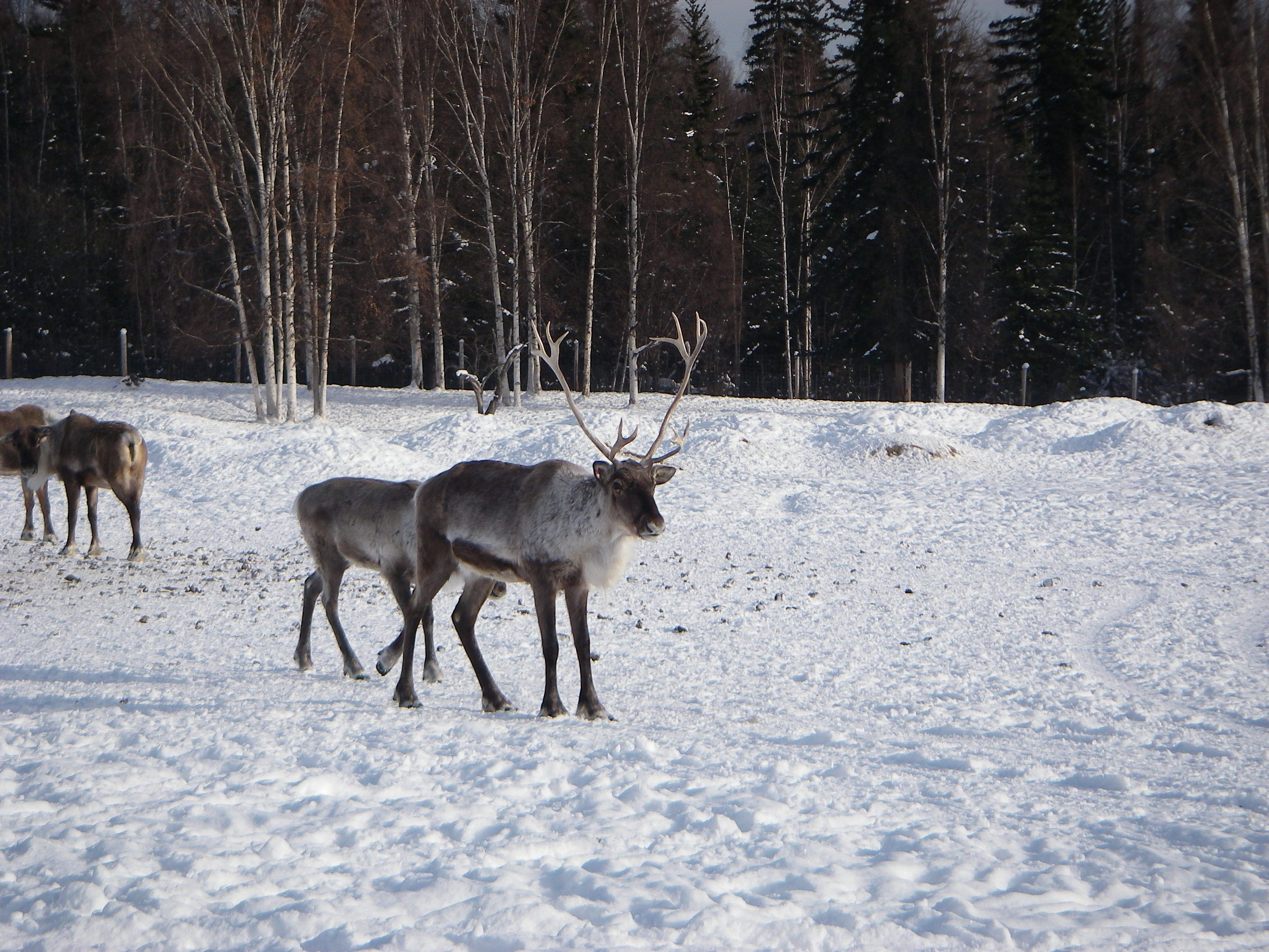 Caribou walk across the field at the Robert G. White Large Animal Research Station to check out the visitors. Fairbanks, Alaska.