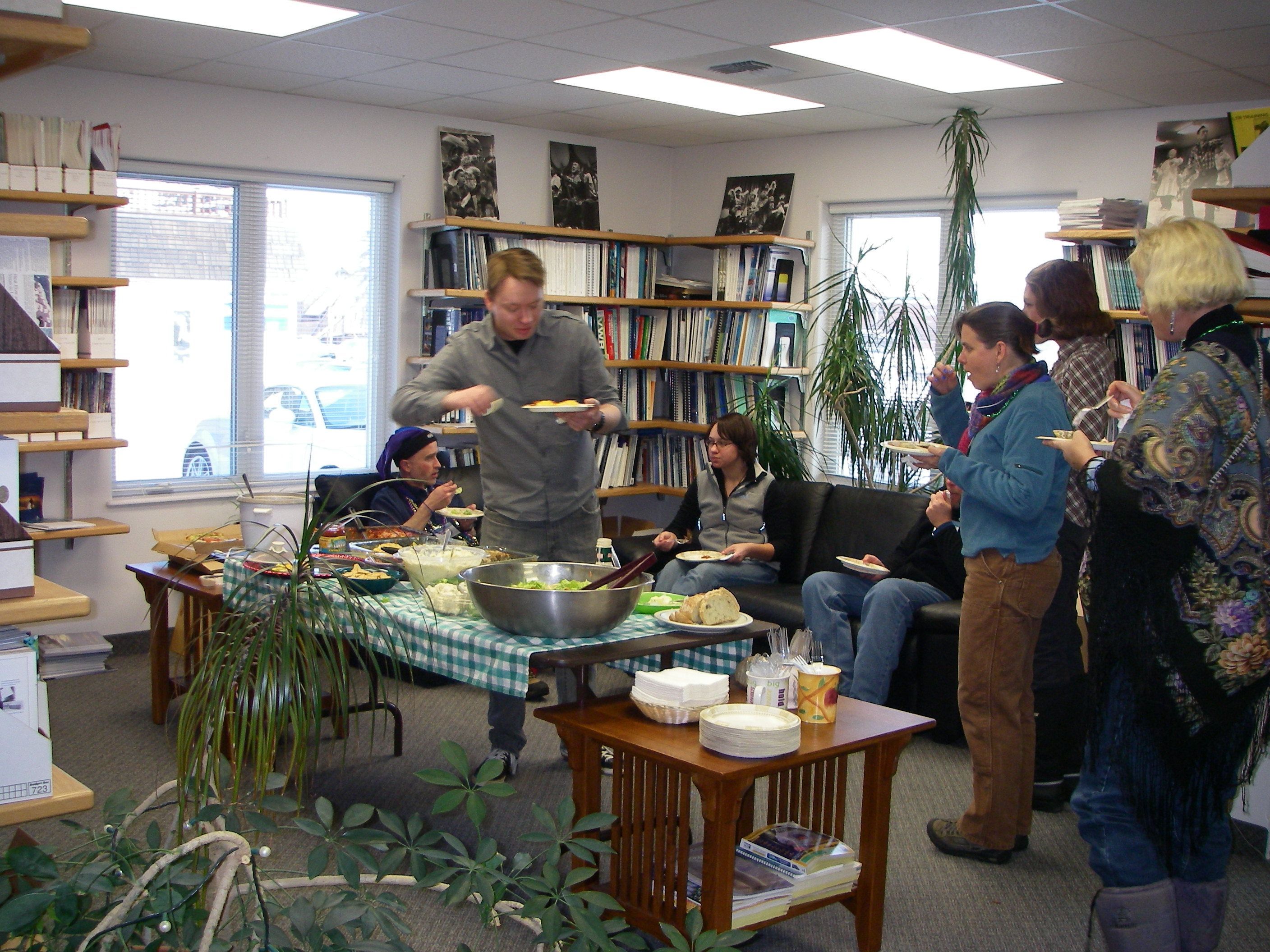 Members of the PolarTREC class of '09 ate sitting in the conference room and standing in the lobby at the potluck lunch served by the staff. At the ARCUS office in Fairbanks, Alaska.