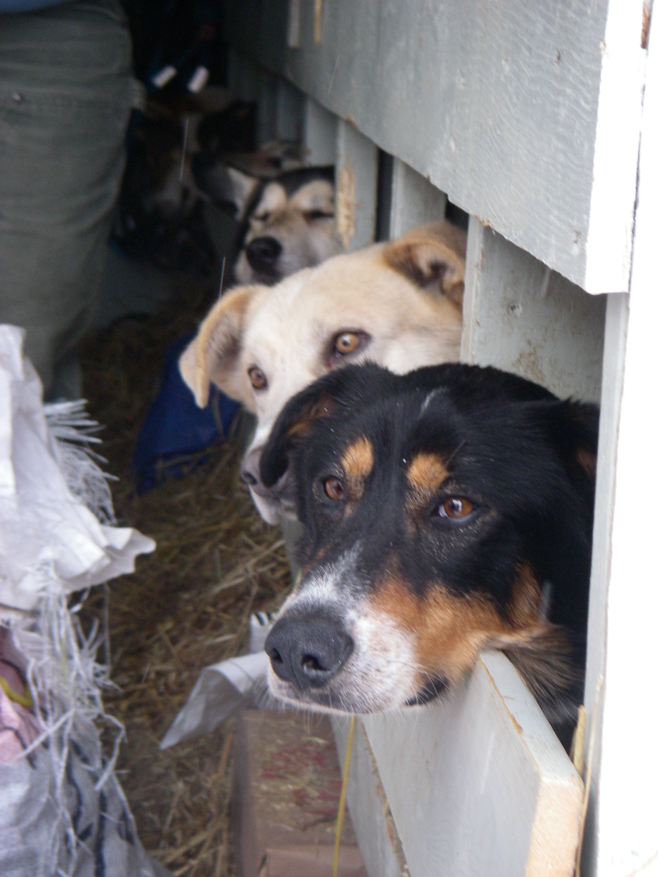Warren Palfrey's dogs reach their heads out of the kennel boxes for a friendly pat on the head. This team had just completed the 1,000-mile Yukon Quest dogsled race. Fairbanks, Alaska.
