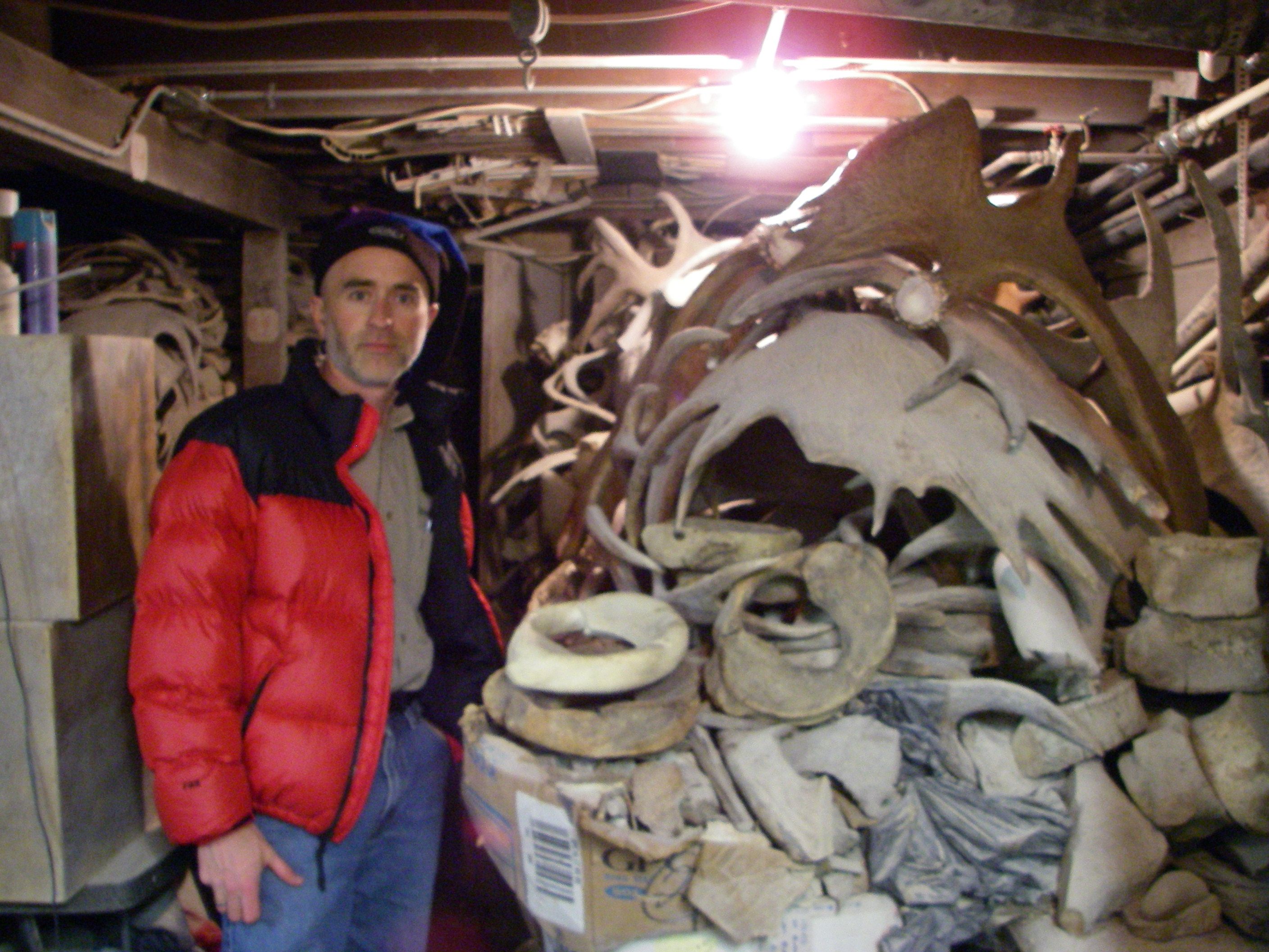Tim Martin looks over a pile of antlers in the basement of the Old Curiosity Shop. Fairbanks, Alaska.
