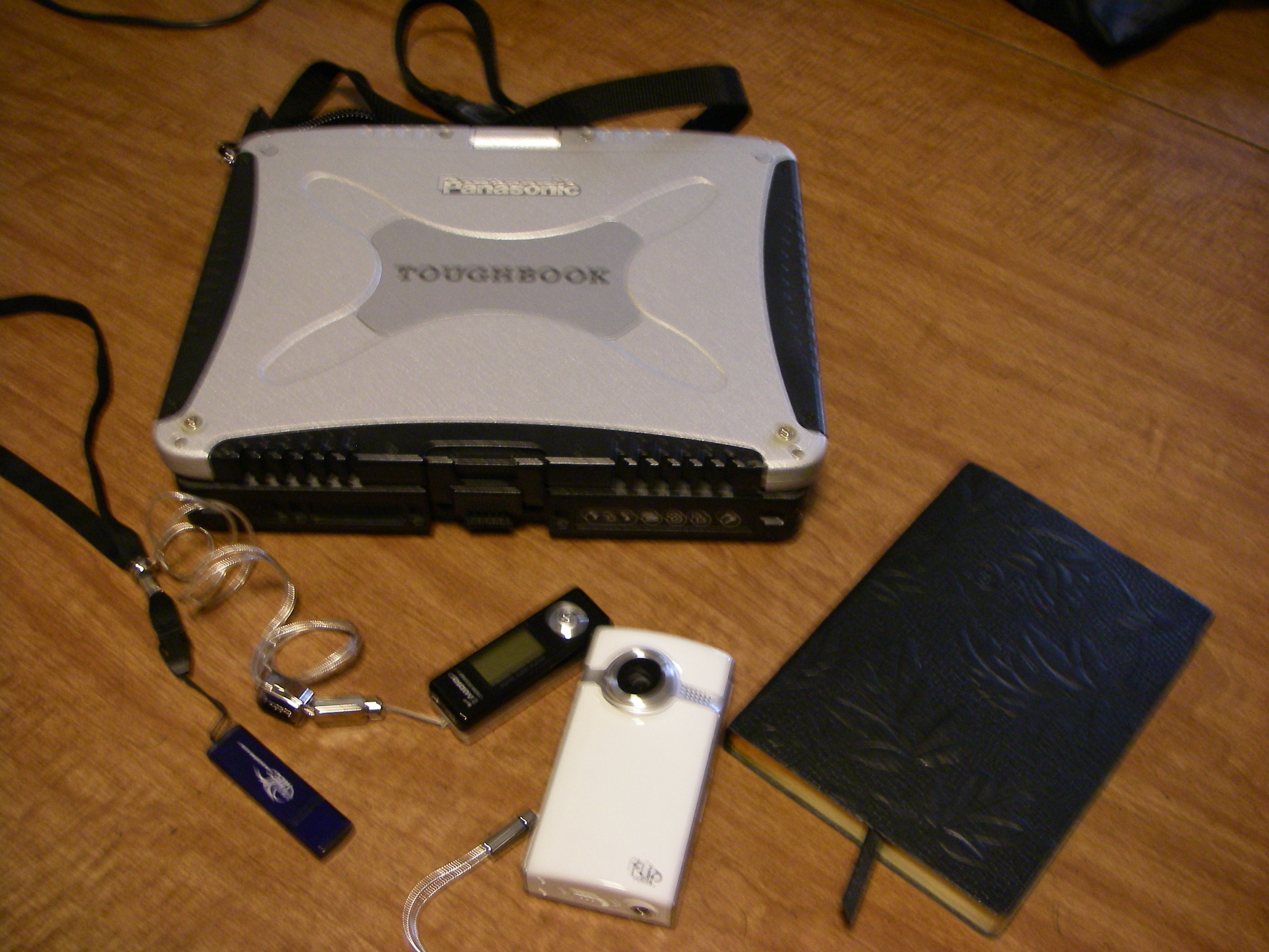 Barney Peterson's computer, video camera, jump drive, voice recorder, and journal, all ready to take into the field. This photo was taken with the camera that went along too. At the Peterson residence in Brier, Washington.