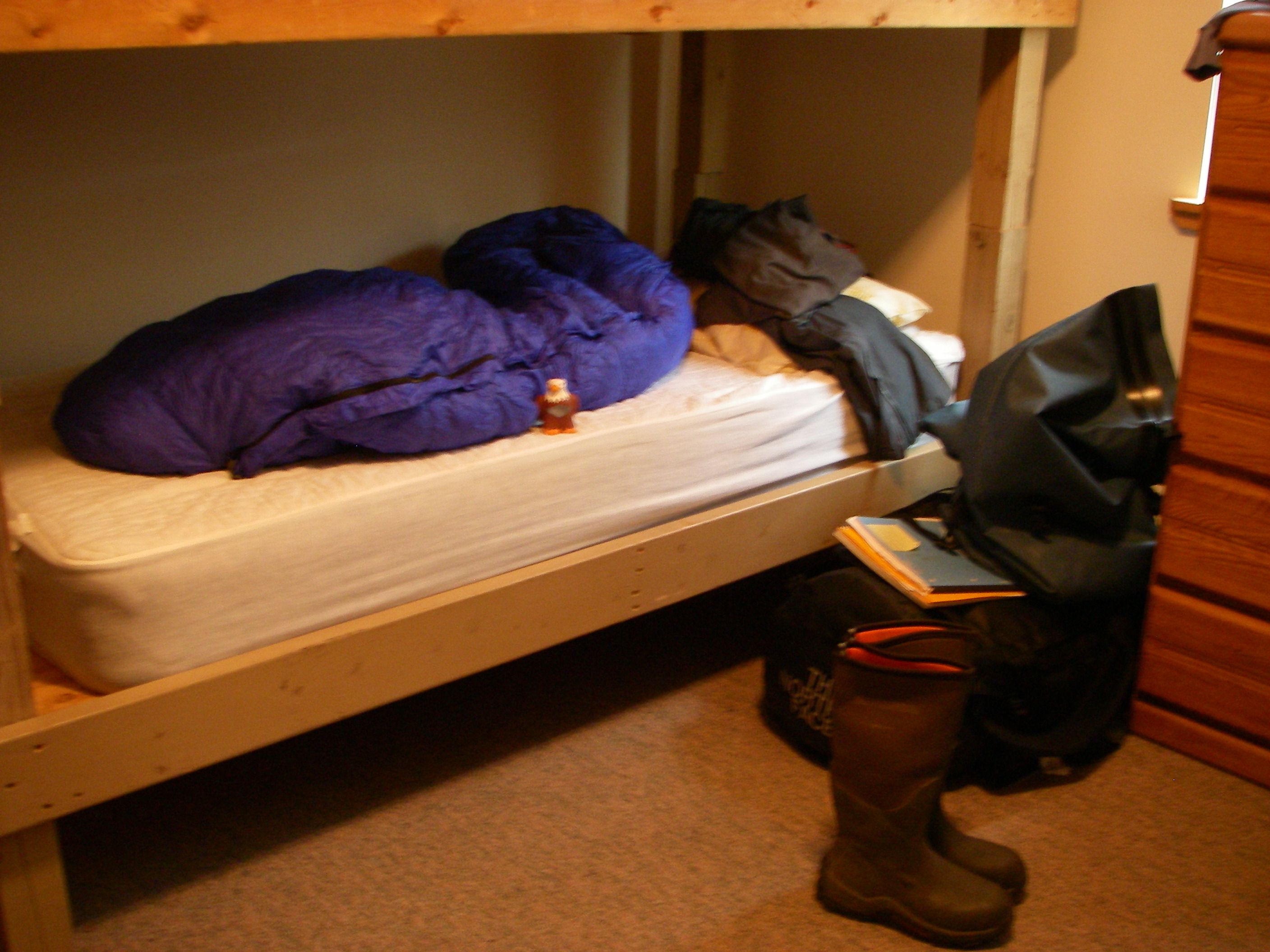 Spirit, the James Monroe Elementary School mascot, sits next to Barney Peterson's sleeping bag and pack in the bunkhouse in Dillingham, Alaska.