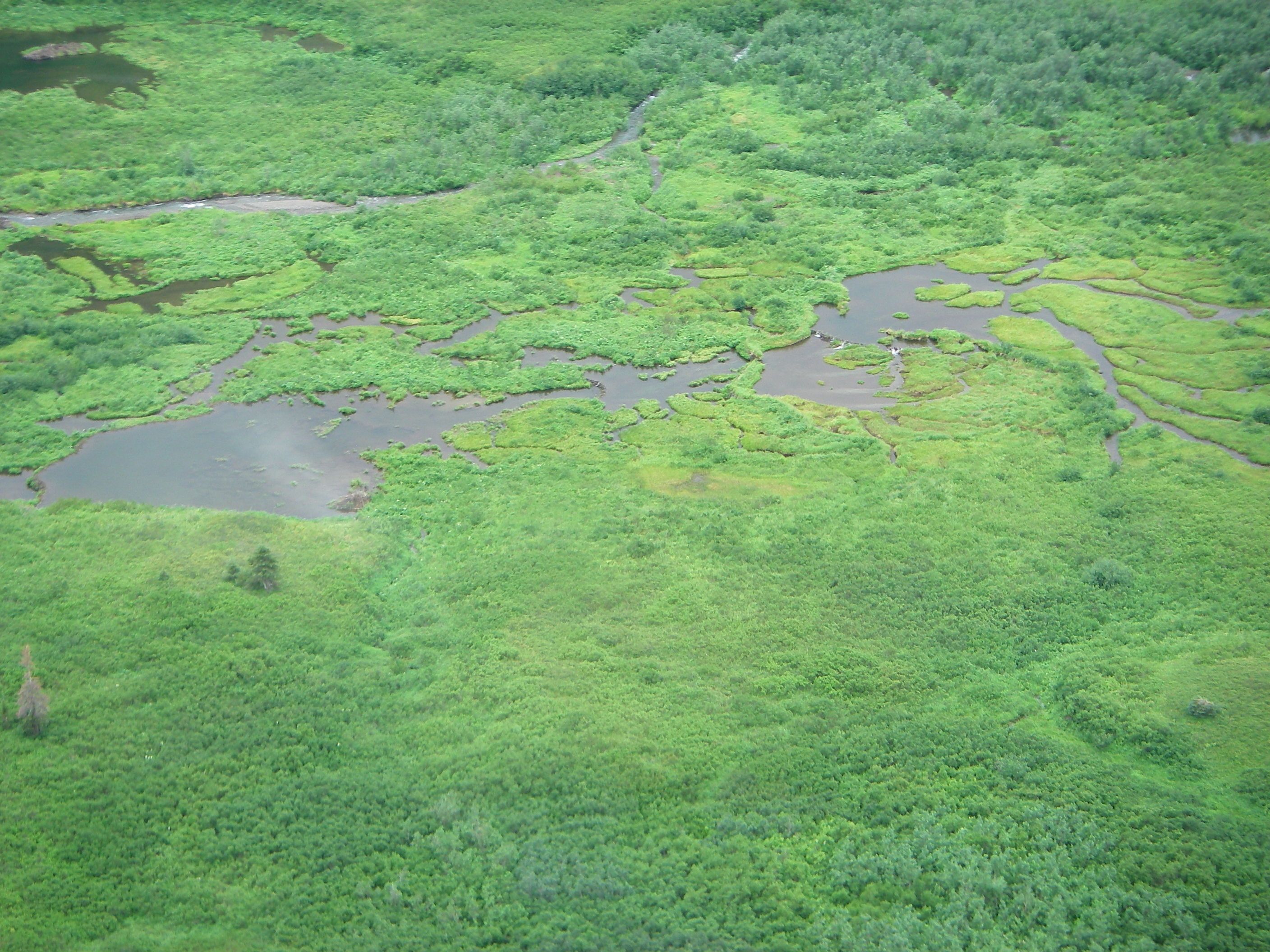 Looking down on a network of streams with beaver dams and lodges, from the plane flying over the Aklun Mountains toward Cascade Lake. Aklun Mountains, Alaska.