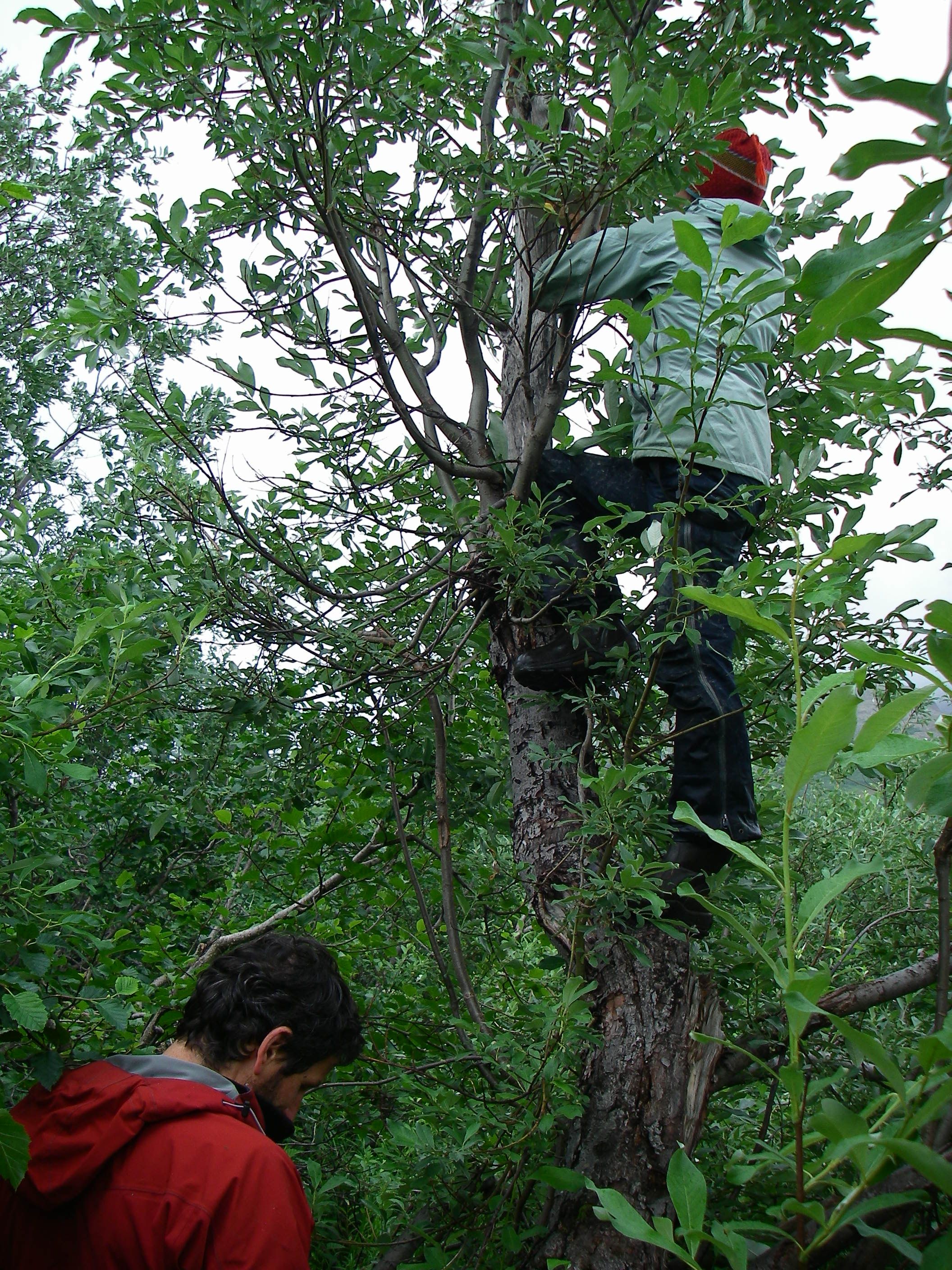 Heidi Roop climbed to the top of a tree on the beach to connect cables. This was done so that the team could retrieve data from a temperature logger deployed on a previous research trip to Cascade Lake. Darrell Kaufman uses a laptop to download the data stored over a period of two years. Cascade Lake, Alaska.