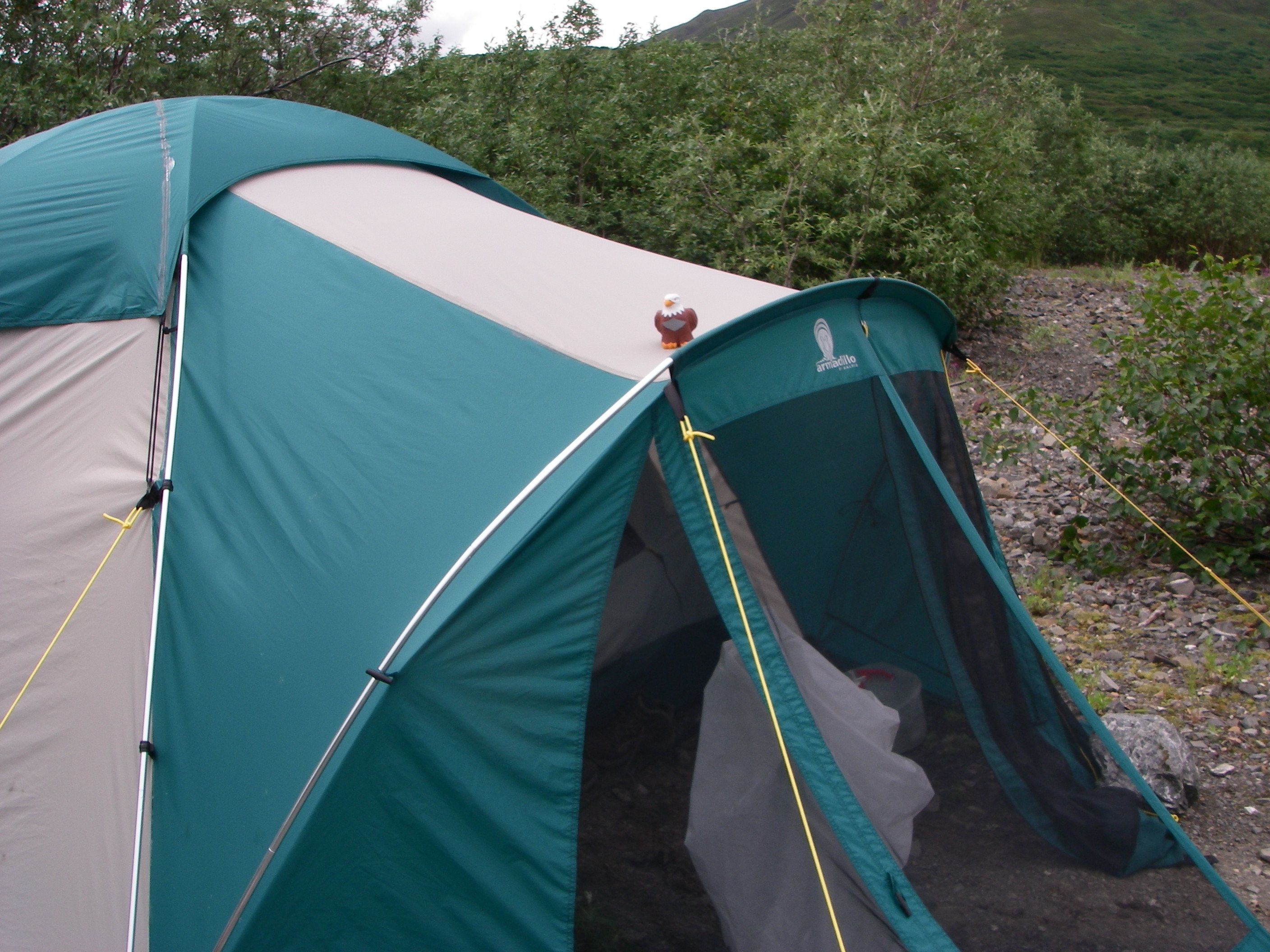 Spirit, the James Monroe Elementary School mascot, watches the camp from his perch atop the cook tent at the Cascade Lake site. Cascade Lake, Alaska.