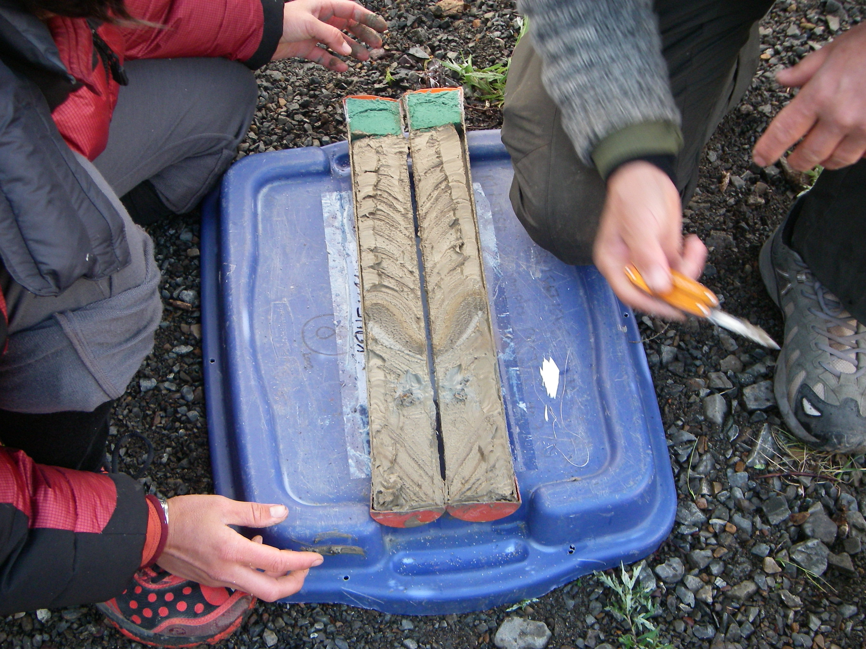 Darrell Kaufman and Heidi Roop examine a split core for marker beds that can help identify known climate events in the history of the lake and help them establish dating for more recent events. Cascade Lake, Alaska.
